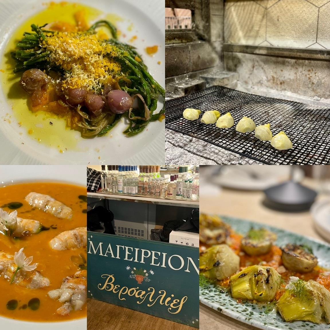 Για βραδινό πήγα όχι μία, αλλά δύο φορές στις Βερσαλλίες, ένα μαγειρείο αποκάλυψη. Στο ανάκτορό του, ο Γιάννης Κούμανης, αυτοδίδακτος μάγειρας με φαντασία που οργιάζει, ακούραστος και γεμάτος έξυπνο, λεπτό και καυστικό χιούμορ, -έτσι εξηγείται το αυτοκρατορικό όνομα του μαγεριού!- ξεσαλώνει στην κυριολεξία στις φωτιές και τις κατσαρόλες, βγάζοντας φαγητά αντάξια έμπειρων, ταξιδεμένων και εξασκημένων ουρανίσκων. Στη μνήμη μου έχει χαραχτεί, περισσότερο από όλα, η νοστιμιά του παλαιωμένου σπιτικού ξινού τραχανά με καραβίδες σχεδόν ωμές και την απίθανα λεπτή μυρωδιά και γεύση από τα λεπτεπίλεπτα άνθη του άγριου σκόρδου. Ο Γιάννης δεν κάνει σκόντο ούτε στο παραμικρό υλικό που θα μπει στην κουζίνα του, από το κρέας και τα ψάρια, τα θαλασσινά, από τα ζαρζαβατικά και τα βότανα, από το επώνυμο εξαιρετικό παρθένο ελαιόλαδο, τις ελιές και το ψωμί. Είναι όλα ντόπια κι όλα εκλεκτά. Καθώς μιλάγαμε έξω από το μαγαζί και το μάτι του έπεσε πάνω στην καταπράσινη μουριά, κατέβασε την επόμενη ιδέα του για ντολμαδάκια με τα φύλλα της που τότε ακριβώς μεγάλωναν. Και τι δεν θα έδινα να τα δοκιμάσω!