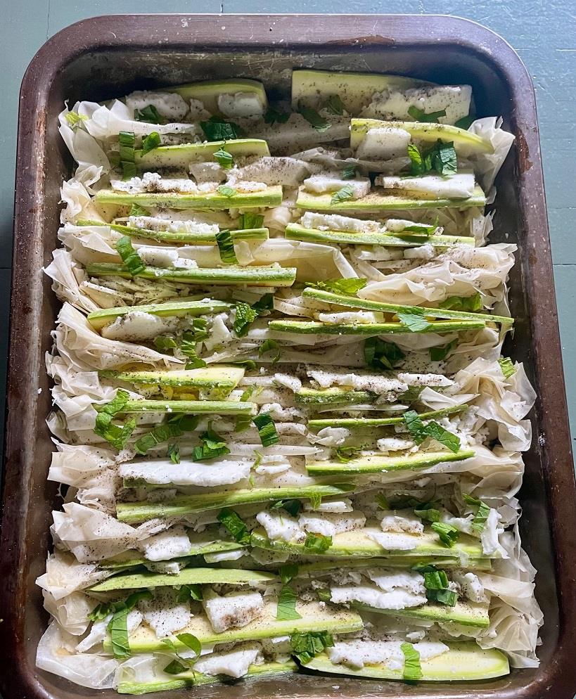 Πλένουμε και σκουπίζουμε καλά 8 μέτρια κολοκυθάκια και με ένα κοφτερό μαχαίρι ή μαντολίνο τα κόβουμε σε λεπτές λωρίδες, πάχους όχι παραπάνω από 3 χιλιοστά. Τα αλατοπιπερώνουμε (για το αλάτι συνυπολογίζουμε το πόσο αλμυρή είναι η φέτα) και τα τοποθετούμε ενδιάμεσα από τις πτυχώσεις των στρωμένων φύλλων. Κι εδώ πρέπει να προσέχουμε να είναι οι κινήσεις μας απαλές για να μην στριμώχνουμε τα υλικά. Αναλόγως του μήκους των λωρίδων, θα χρειαστεί να κόψουμε κάποιες για να συμπληρώσουμε την κάθε στήλη και να φτάσουμε, έτσι, μέχρι την άκρη του ταψιού. Κόβουμε σε λεπτές λωρίδες και τυρί φέτα -προτιμάμε τη σκληρή- και τις τοποθετούμε όπου βρούμε κενό, ακόμη και στην ίδια πτύχωση με τα κολοκύθια. Δεν πειράζει που επειδή η φέτα είναι εύθρυπτη θα κόβεται σε μικρότερα κομματάκια, αρκεί, όπως κάναμε και με τα κολοκύθια, να συμπληρώνουμε κάθε στήλη. Πασπαλίζουμε με ψιλοκομμένο φρέσκο δυόσμο.