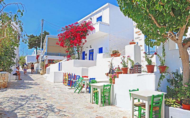 Φουντωτές μπουκαμβίλιες μπλέκονται σε γαλανά παραθυρόφυλλα ενώ το λευκό των πέτρινων σπιτιών καθρεφτίζει πάνω του τις λαμπερές ηλιαχτίδες που φτιάχνουν ένα θαρρείς καρτποσταλικό τοπίο. Τα πλακόστρωτα σοκάκια γεμίζουν με ζωή κάθε καλοκαίρι, αφού τα σεργιανίζουν πλήθος Ελλήνων και ξένων τουριστών που μένουν έκθαμβοι από τη φυσική ομορφιά της Χώρας, ενώ περιδιαβαίνουν τα γραφικά μαγαζάκια για να αγοράσουν ενθύμια των αξέχαστων διακοπών τους. Λίγο πιο πέρα πάνω από το καρνάγιο το εκκλησάκι του Αγίου Νικολάου σου χαρίζει μια ανεμπόδιστη μα και φανταστικοκαταπληκτική θέα που φυλακίζει στο μάτι σου 9 ολόκληρα νησάκια.