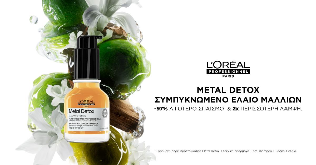 Η σειρά Metal Detox της L’Oréal Professionnel κατά των μεταλλικών στοιχείων προστατεύει τα μαλλιά από την προσκόλληση μεταλλικών στοιχείων μετά τις υπηρεσίες βαφής, balayage και ξανοίγματος. Η συγκέντρωση των μεταλλικών στοιχείων στο εσωτερικό της τρίχας μπορεί να προκαλέσει σπάσιμο της τρίχας και να επηρεάσει αρνητικά το χρωματικό αποτέλεσμα. Τα μαλλιά γίνονται πιο δυνατά. Το χρώμα διαρκεί περισσότερο με 2x περισσότερη λάμψη.