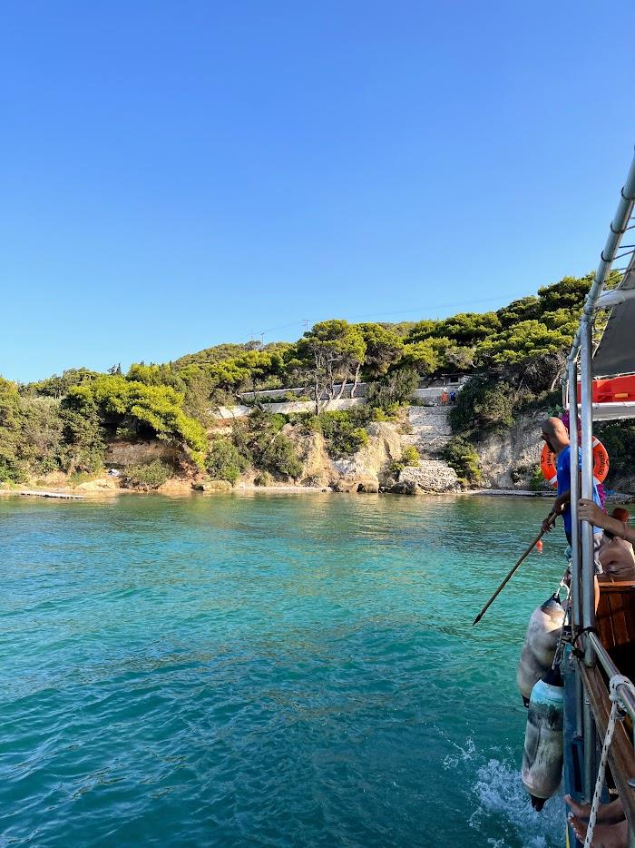 Ο Δημήτρης και το πλήρωμά του, σούπερ κεφάτοι όλοι τους, λύνουν τους κάβους και το ταξίδι ξεκινά. Πρώτη στάση, λίγα λεπτά αργότερα, η Βυθισμένη Σπηλιά, στο σημείο με τα ονειρικά σμαραγδένια νερά που λέγαμε στην αρχή. Η σκαλίτσα κατεβαίνει, αλλά σχεδόν κανείς δεν την χρησιμοποιεί, όλοι βουτάνε απευθείας από το καΐκι, πώς να αντισταθείς σε μια βουτιά από ψηλά, έχει κάτι από τα παιδικά σου καλοκαίρια. Η σπηλιά, με ενημερώνουν, βρίσκεται πολύ κοντά σε εκείνη την άλλη, την πιο διάσημη, την Ερωτοσπηλιά στην οποία δεν χωράς να σταθείς Κυριακή μεσημέρι. Την είπαν βυθισμένη επειδή το στόμιό της βρίσκεται ακριβώς στο ύψος της θάλασσας. Τα νερά μπροστά της δεν έχουν όλη μέρα αυτή την απόχρωση, την δημιουργεί η γωνία από την οποία πέφτει το φως του ήλιου. Μακάριοι οι μη πρωινοί τύποι, αυτοί θα αξιωθούν την βασιλεία των νερών, σκέφτομαι.