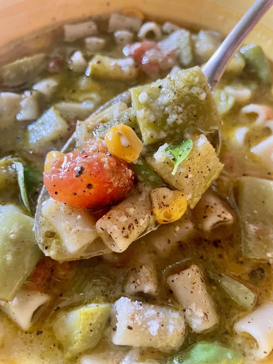 Παρόλο, λοιπόν, που μία gazpacho είναι πάντα καλοδεχούμενη, πού και πού χρειάζεται και μια σούπα με δάγκωμα, να έχει υπόσταση, να είναι πιο χορταστική και να αποτελεί κανονικό γεύμα. Γι’ αυτόν τον σκοπό η μινεστρόνε είναι ό,τι πρέπει. Τη μινεστρόνε του Αυγούστου τη φαντάστηκα πιο ελαφριά κι έτσι τα φρέσκα φασολάκια πήραν τη θέση των ξερών φασολιών και τη θέση του καρότου και του σέλερι κατέλαβε πανάξια το καλαμπόκι που τώρα είναι στην καλύτερη εποχή του. Τα ζαρζαβατικά, μαγειρεμένα στο ελάχιστο, είναι τραγανά κι ολοζώντανα, η ντομάτα είναι σχεδόν ωμή και η σούπα πλημμυρίζει άρωμα από το θυμάρι και τον βασιλικό. Βεβαίως, σερβίρεται παγωμένη κι η δροσιά της είναι ανακουφιστική. Το ότι πέρα από νόστιμη είναι και υγιεινή, είναι ηλίου φαεινότερο. Το τελευταίο της, σπουδαίο, πλεονέκτημα είναι ότι πιο πολλή ώρα παίρνει μέχρι να κρυώσει παρά για να μαγειρευτεί. Ορίστε, λοιπόν.