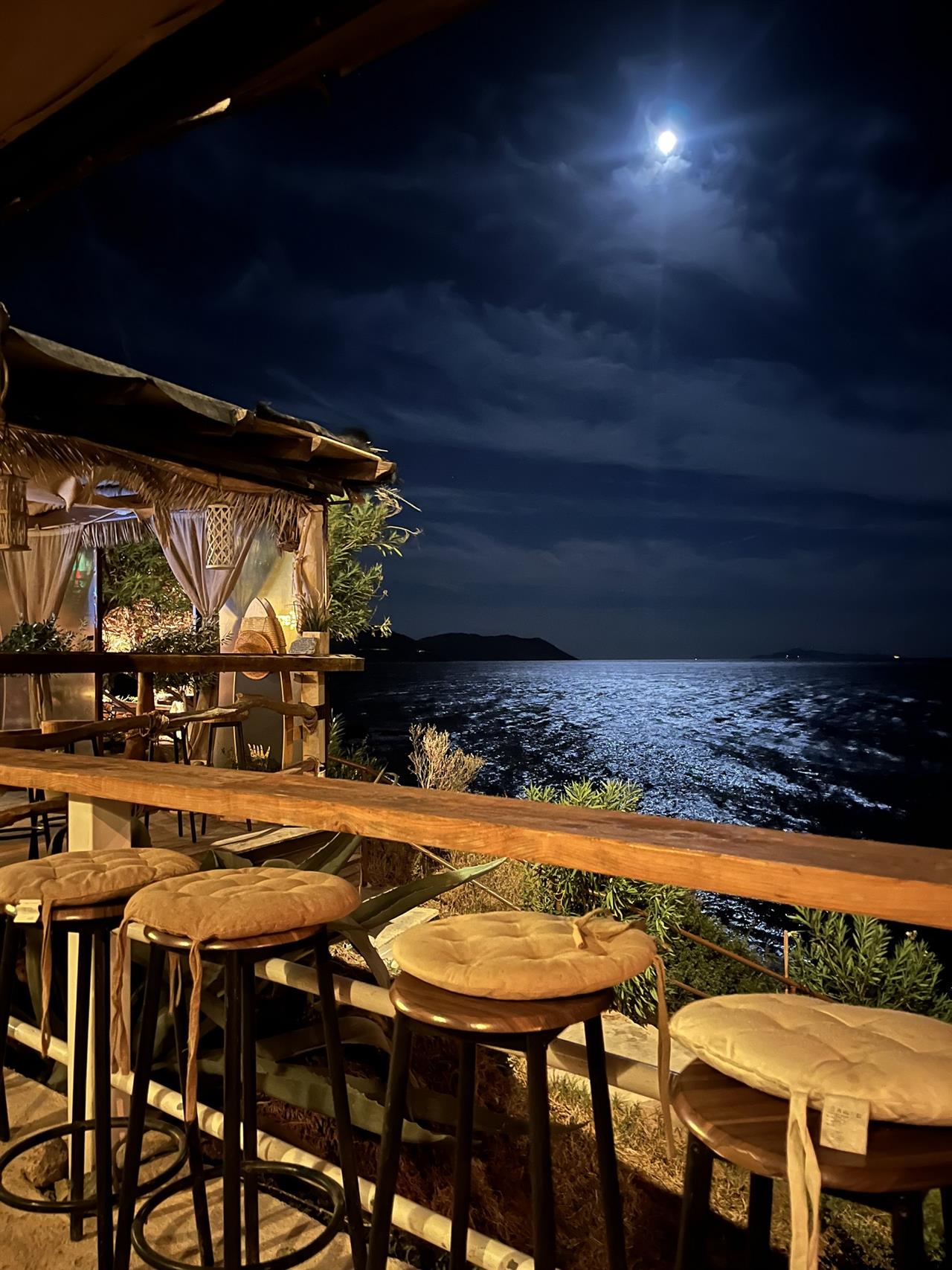 Ψάθινες ομπρέλες, πετρόχτιστα σκαλάκια, κορμοί δέντρων που γίνονται σκαμπό, κοχύλια που κρέμονται από την ξύλινη οροφή, κι ένα χαλικοστρωμένο πλάτωμα που αγναντεύει την θάλασσα από ψηλά. Αν μάλιστα πετύχεις και ολόγιομο φεγγάρι να καθρεφτίζεται στην θάλασσα, κερδίζεις το Τζακ Ποτ εικόνων που κουβαλάς από τα καλοκαίρια σου σε κάποιο νησί. Μόνο που εδώ δεν είσαι σε νησί. Είσαι ένα μισάωρο μακριά από το σπίτι σου.