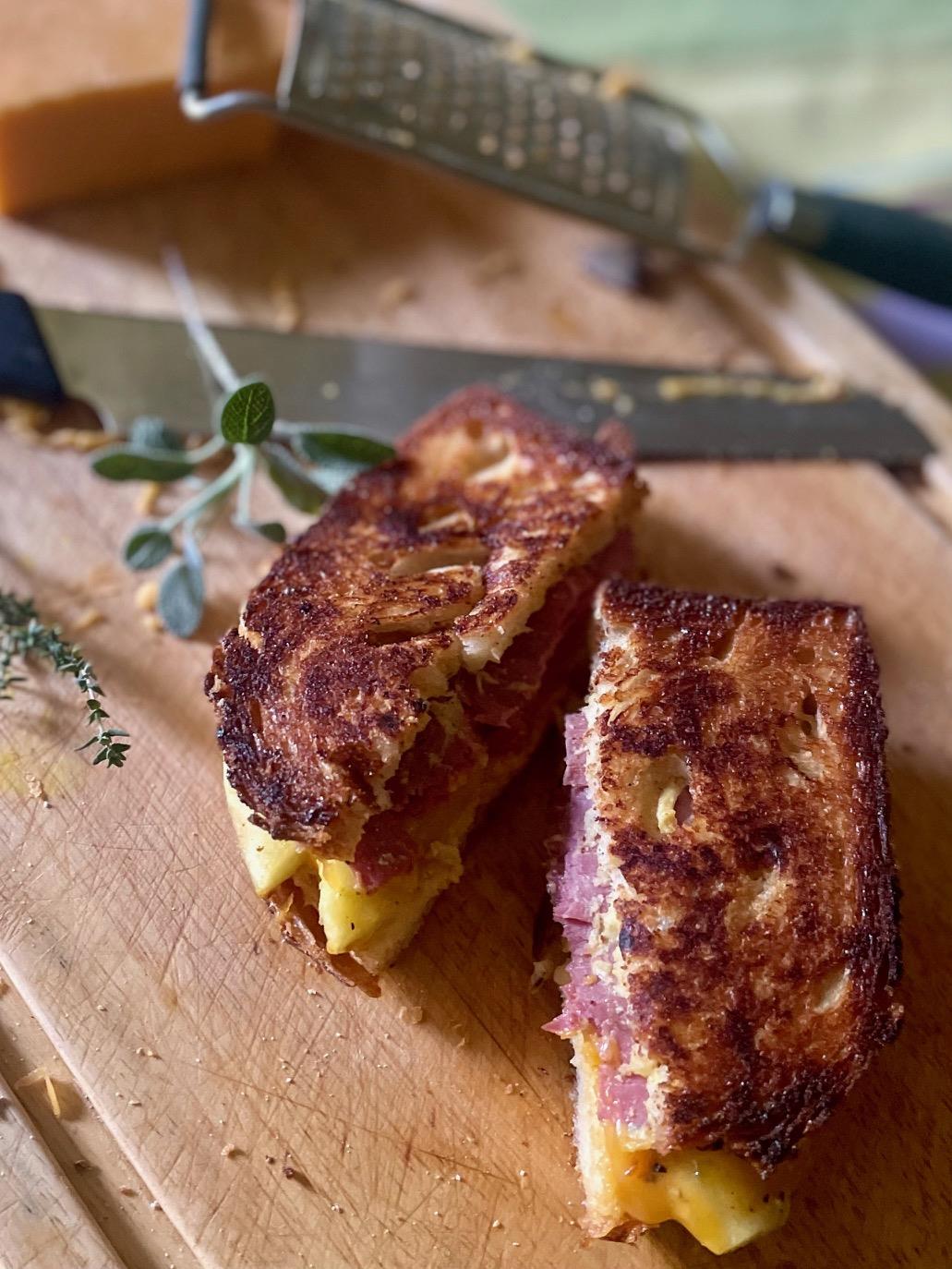 ΤΟΣΤ ΣΤΟ ΤΗΓΑΝΙ (GRILLED CHEESE) ΜΕ ΜΗΛΑ, ΠΑΣΤΡΑΜΙ & CHEDDAR