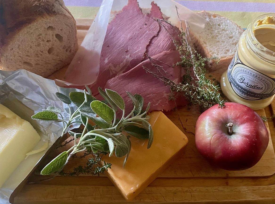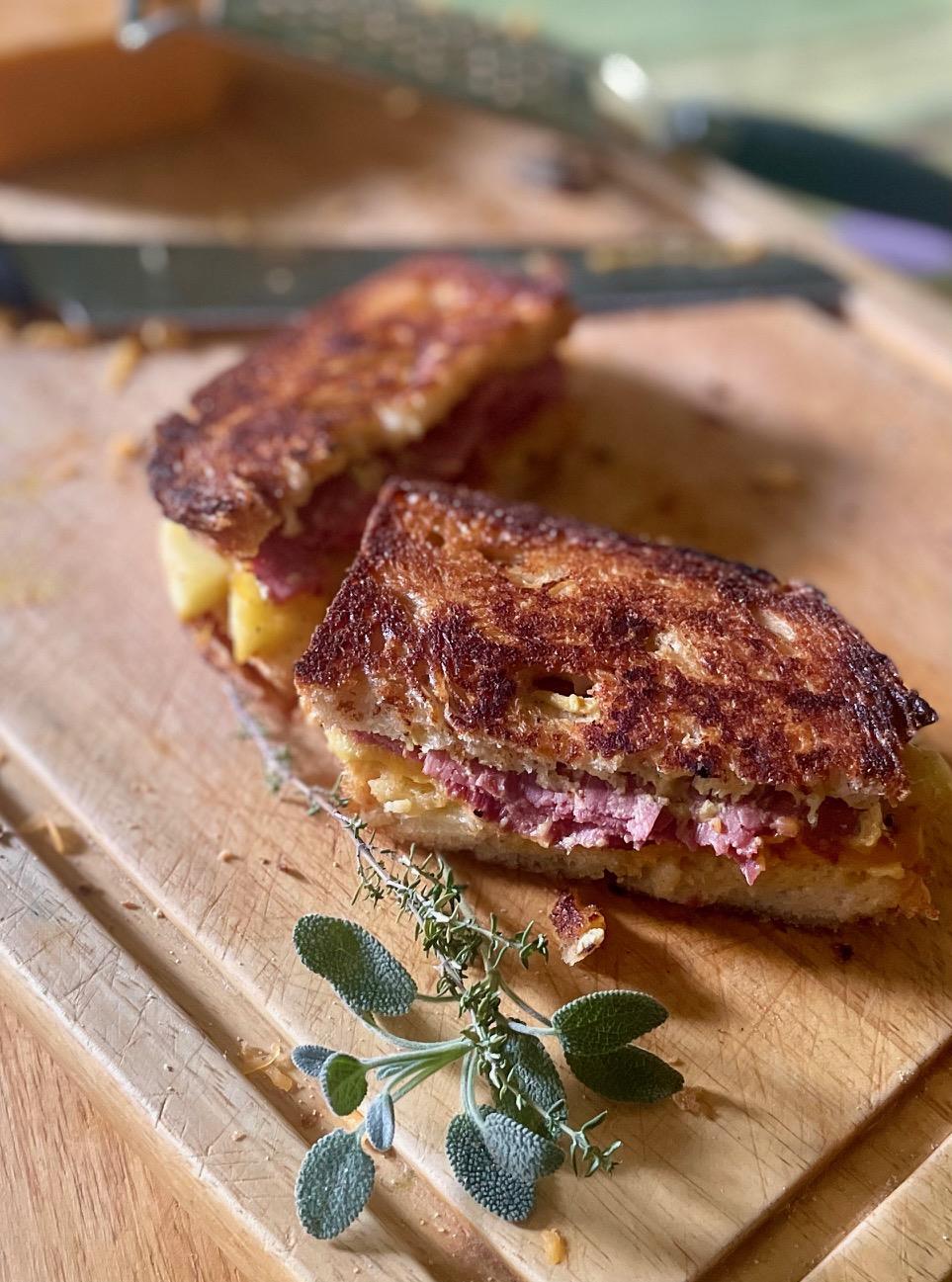 Σε ένα τηγάνι λιώνουμε, σε μέτρια προς δυνατή φωτιά, λίγο αγελαδινό βούτυρο και σοτάρουμε ένα μήλο ξεφλουδισμένο και κομμένο σε λεπτές κυδωνάτες φέτες με λίγο φρέσκο φασκόμηλο και λίγο φρέσκο θυμάρι. Πιπερώνουμε με φρεσκοτριμμένο πιπέρι. Μόλις τα μήλα πάρουν χρώμα, μαλακώσουν λίγο και αποκτήσουν εξωτερική κρούστα τα αφαιρούμε από το σκεύος, το ίδιο και τα βότανα. Αλείφουμε γενναιόδωρα τις τις τέσσερις εσωτερικές πλευρές από τέσσερις σχετικά χοντρουλές φέτες ψωμιού (κατά προτίμηση πυκνού προζυμένιου) με μουστάρδα της αρεσκείας μας. Στις δύο από αυτές μοιράζουμε τα μήλα και από πάνω τοποθετούμε από δύο φέτες παστράμι και τυρί cheddar που τρίβουμε εκείνη τη στιγμή, σε ποσότητα τέτοια, που να καλύπτει όλη την επιφάνεια του ψωμιού (μία μικρή χούφτα περίπου ανά σάντουιτς).