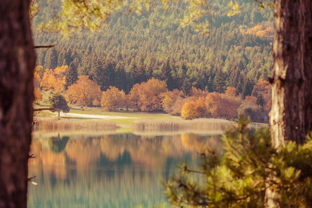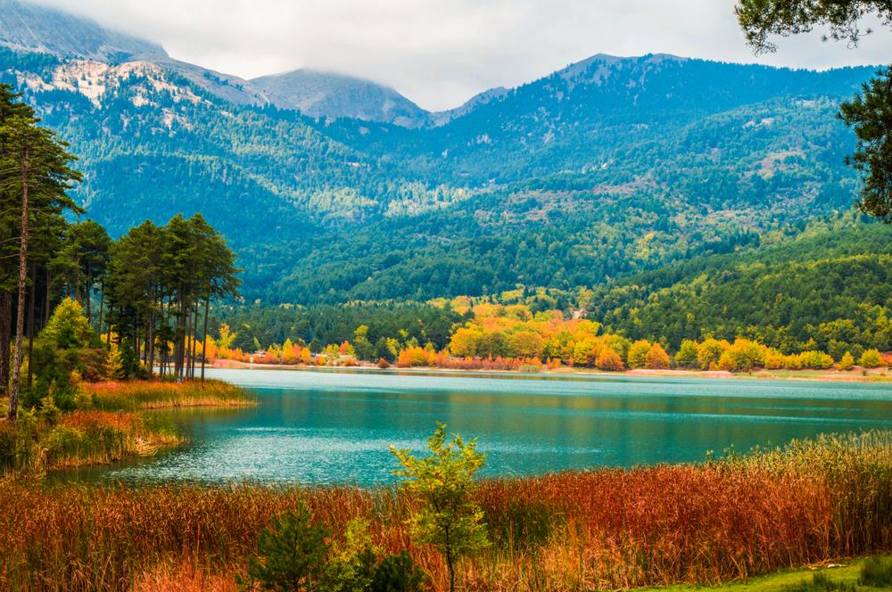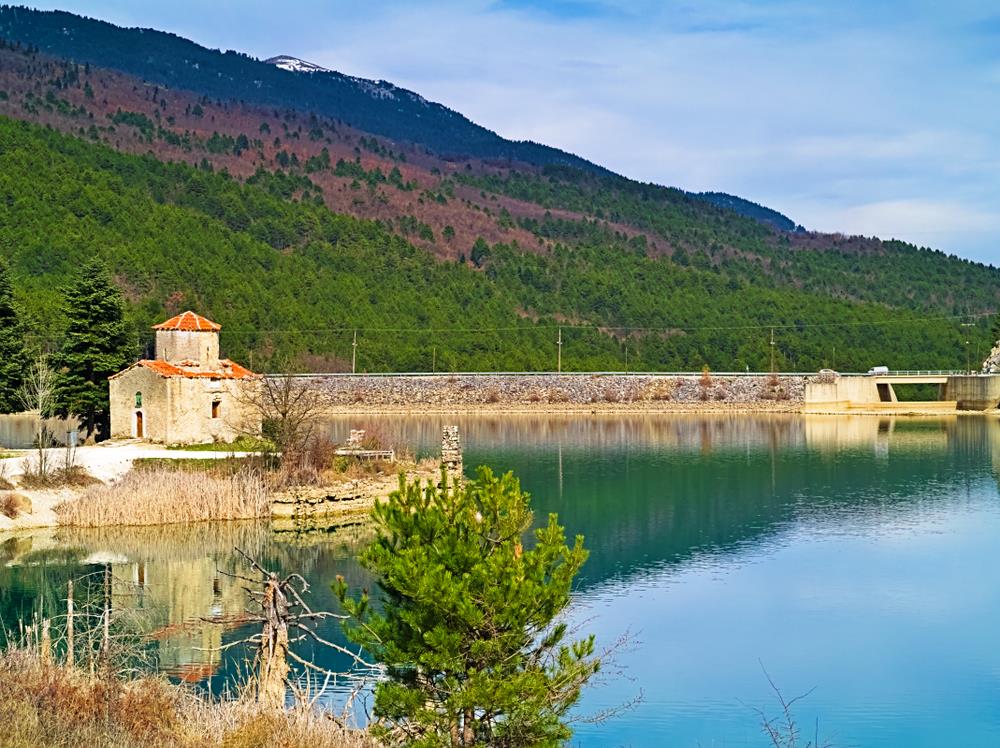 Ακίνητα, βαθυγάλαζα νερά αντανακλούν τις ηλιαχτίδες. Σταχτοτσικνιάδες τσαλαβουτούν στην επιφάνειά τους. Καταπράσινες βουνοπλαγιές κλείνουν σαν αγκαλιά τριγύρω. Μαυρόπευκα, πλατάνια, λεύκες και βελανιδιές πλέκουν τα κλαδιά τους μισοκρύβοντας τον ουρανό. Θα μπορούσαμε να είχαμε ξεμπερδέψει και με ένα απλό «το τοπίο είναι μαγικό», η λίμνη φταίει για τούτο τον ποιητικό οίστρο.
