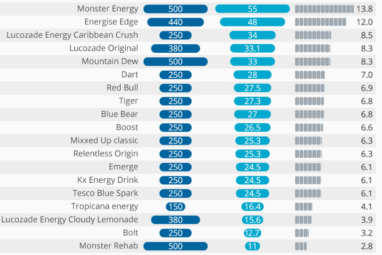 Νευρικότητα και διεγερσιμότητα: ο συνήθης ύποπτος από τα συστατικά που περιέχουν, η καφεΐνη, δυνητικά μπορεί να δημιουργήσει άγχος, τρέμουλο και ταραχή. Στην διεγερσιμότητα συνεισφέρει και η περιεκτικότητά τους σε ζάχαρη, η οποία, όπως φαίνεται και στην παρακάτω εικόνα, δεν είναι καθόλου αμελητέα. Υπάρχουν περιπτώσεις ανθρώπων που τα συμπτώματα αυτά μπορεί να προκληθούν ακόμα και με την κατανάλωση ενός μόνο κουτιού ενεργειακού ποτού, οδηγώντας ακόμα και σε μειωμένη ικανότητα συγκέντρωσης.