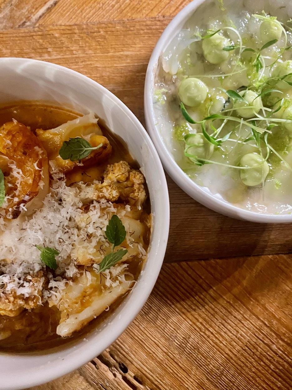 Στα φίνα θαλασσινά, ο φρεσκότατος ωμός τόνος συνδυάστηκε έξυπνα με κρέμα από καπνιστό κρόκο αυγού και τραγανό κράκερ από σουσάμι (€ 28), ενώ τα ντελικάτα ωμά χτένια αρωματίστηκαν διακριτικά με πιπεριές jalapenos, κόλιανδρο, σταφύλι και αγουρίδα, ένα απίθανο υλικό που συναντάμε σπανίως (€ 29). Όσο κι αν απόλαυσα αυτά τα δύο ορεκτικά θαλασσινών, την καρδιά μου έκλεψε το ντουέτο γαρίδας (€ 28): οι ωμές, αριστοτεχνικά κομμένες carpaccio με κρέμα αβοκάντο και οι ψητές με κουνουπίδι, πάστα κόκκινου κάρυ, μελισσόχορτο και τριμμένη φρέσκια καρύδα. Ένα ζευγάρι που θα θυμάμαι για πολύ καιρό.