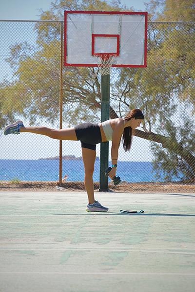 Ενισχύει την ισορροπία και δυναμώνει ολόκληρο το σώμα, με έμφαση στους γλουτούς και τα πόδια. Κρατώντας δύο αλτήρες τις επιλογής σου, εκτέλεσε κάμψη κορμού με το ένα πόδι σε οπίσθια έκταση και τα χέρια με κατεύθυνση προς το έδαφος.