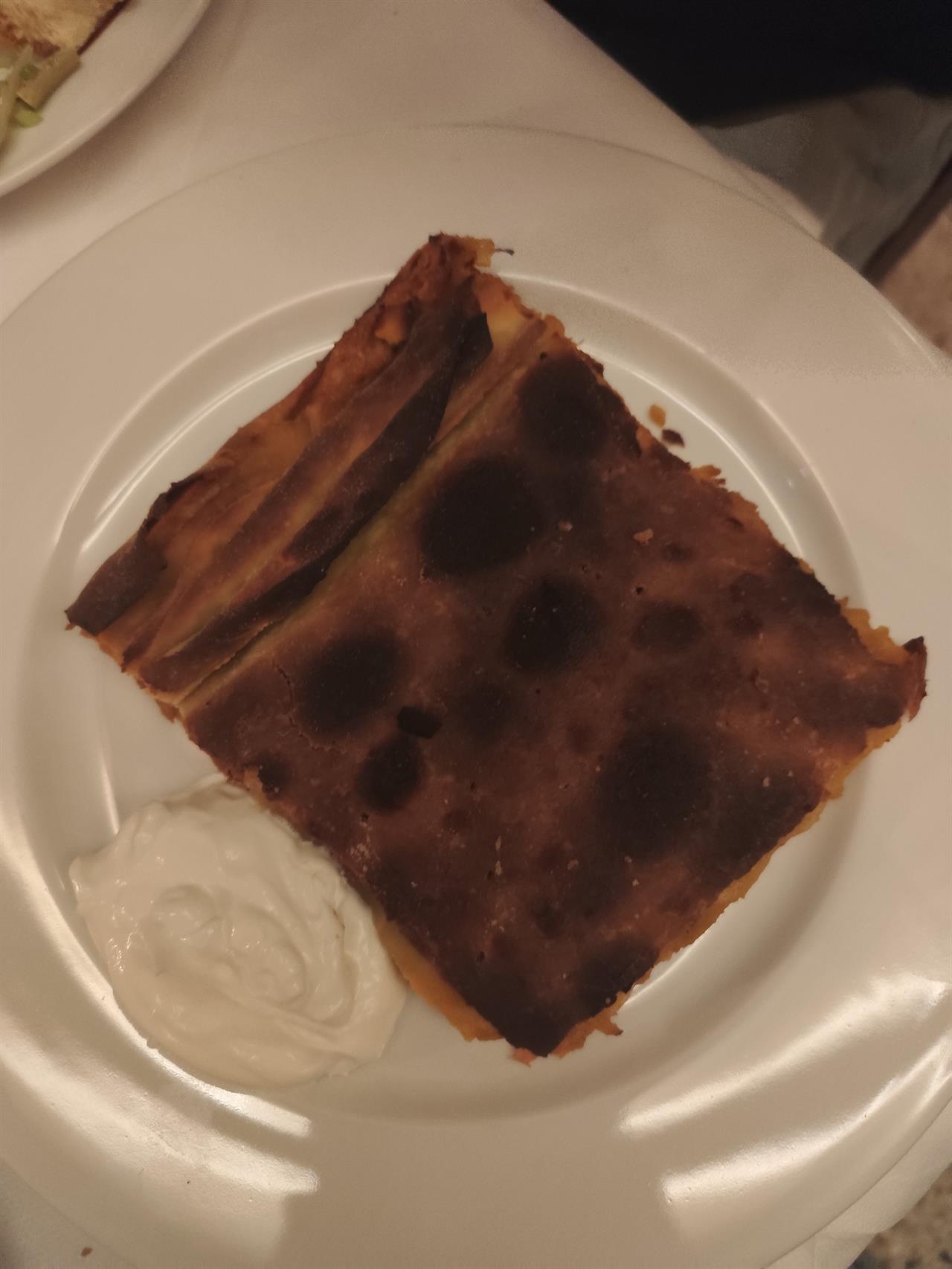 Στεναχωρεθήκαμε ιδιαίτερα που δεν προλάβαμε τα αρνίσια νεφράκια με θρούμπι (9,5€) κι είπαμε να τιμήσουμε την πράσινη ανάμεικτη σαλάτα (8€) η οποία ήταν τεράστια σε μέγεθος κι έξτρα νόστιμη. Βουνά με πάτατες τηγανιτές κομμένες στο χέρι (5€) περιφέρονταν γύρω μας μα εμείς περιμέναμε υπομονετικά την πίτα ημέρας (12€) που μας έλαχε κι είχε γέμιση με πρόβατο, ντομάτα και τυράκι. Το φύλλο ελαφρά καψαλισμένο κι έξτρα τραγανό, μετρημένο στο αλάτι, αγκάλιαζε το μαδημένο σιγομαγειρεμένο αρνάκι φτιάχνοντας μια από τις ωραιότερες κρεατόπιτες που έχουμε δοκιμάσει ποτέ.