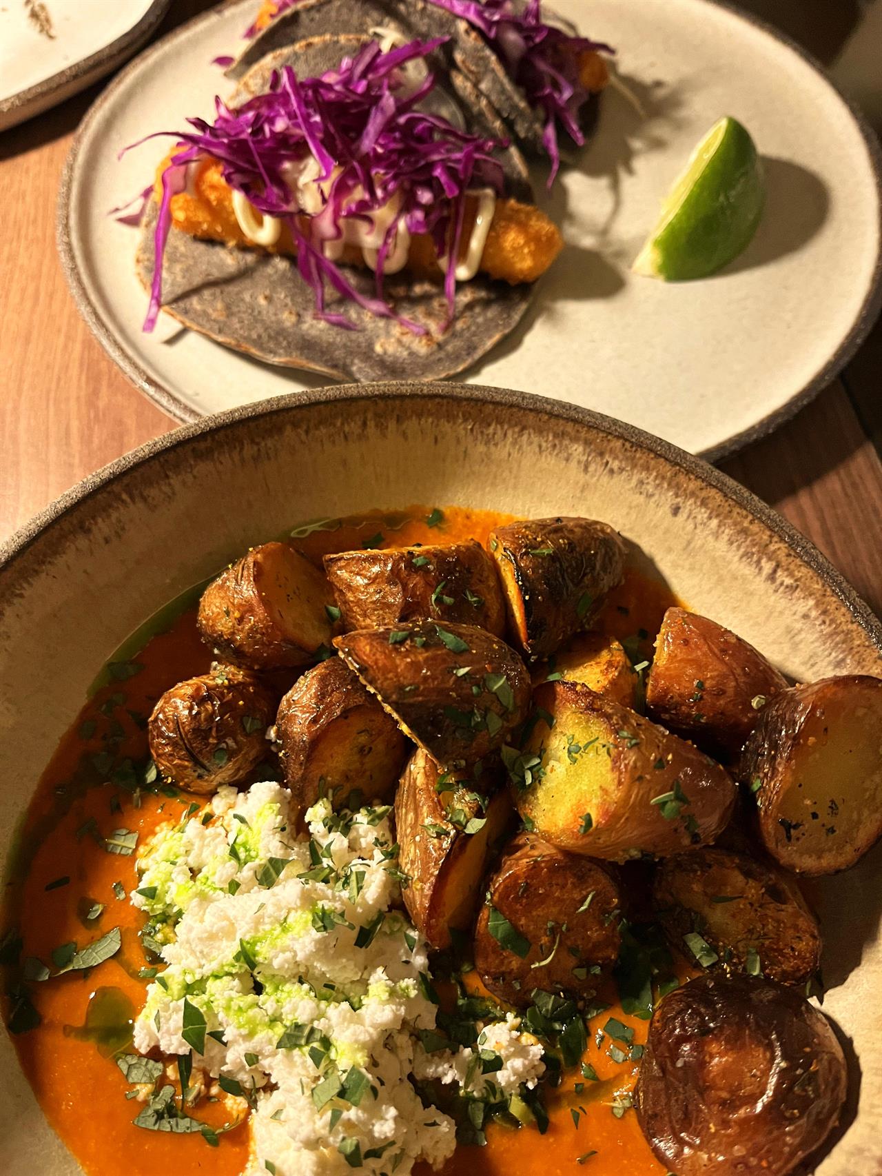 Το μενού είναι μικρό αλλά θαυματουργό, δώδεκα επιλογές-δώδεκα μικρά μαθήματα μεξικάνικης κουζίνας. Χωρίς εξεζητημένες τεχνικές, χωρίς φρου-φρου και αφρούς, με έμφαση στην πρώτη ύλη (εξ ου και το μενού είναι εποχιακό) την οποία ο σεφ αφήνει ελεύθερη να πρωταγωνιστήσει σχεδόν σε όλα τα πιάτα. Λέμε σχεδόν, γιατί στα tacos (12€) με τηγανιτό λαβράκι, πίκλα φινόκιο, habanero mayo και κόκκινο λάχανο, το πανάρισμα ελαφρώς καπελώνει το μεγαλείο του ψαριού. Spoiler alert, όμως, δεν το πιάσαμε από την αρχή, από το συγκλονιστικό guacamole (9€) με μυρωδικά και θαλασσινό αλάτι Maldon θα έπρεπε να ξεκινήσουμε, για να σου πούμε πως είναι μακράν το καλύτερο που έχεις δοκιμάσει στη ζωή σου.