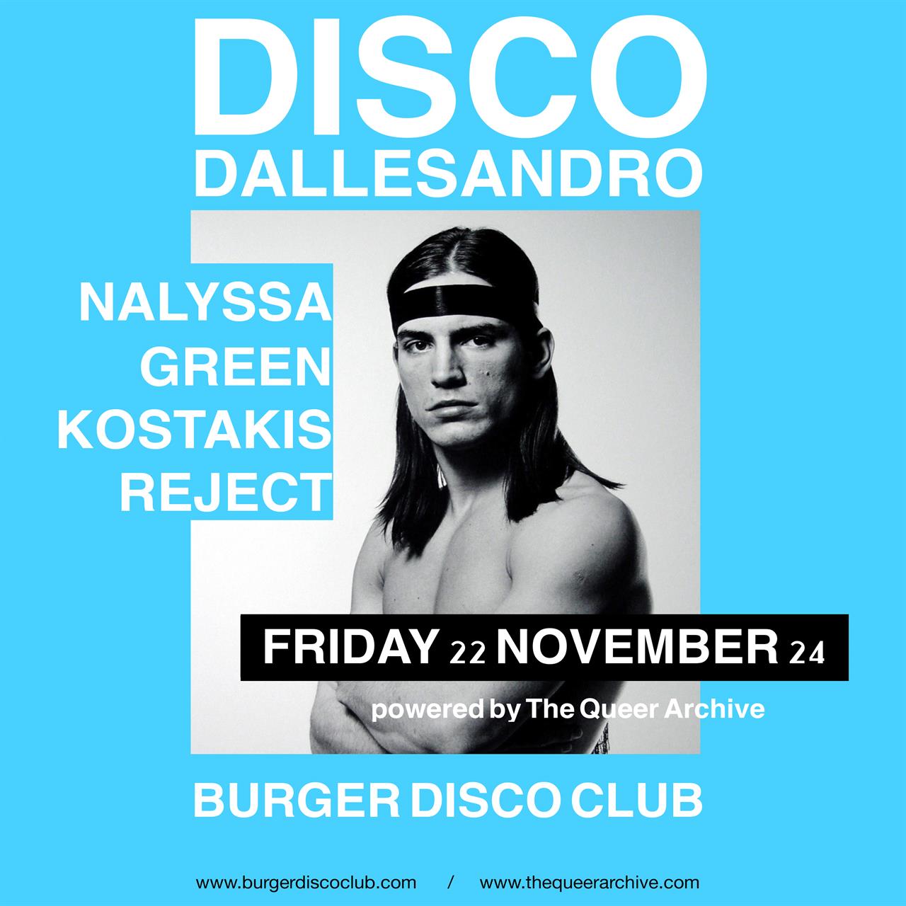 Το Burger Disco Club και το The Queer Archive παρουσιάζουν μια βραδιά γεμάτη τέχνη, μουσική και δημιουργικότητα, την Παρασκευή 22 Νοεμβρίου. Το event περιλαμβάνει ένα DJ set και live εμφάνιση της Nalyssa Green, καθώς και disco - pop - r&b DJ set από τον Kostakis, με την καλλιτεχνική υποστήριξη της Reject.