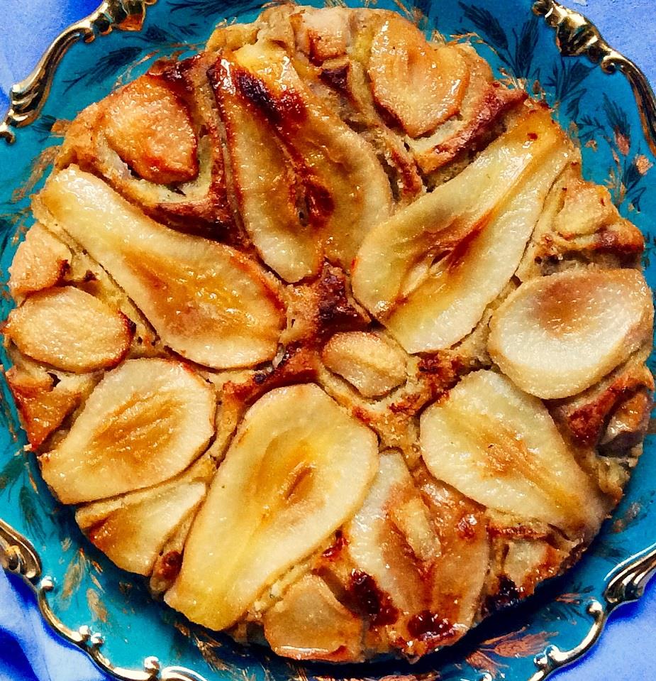 Καθαρίζουμε 3 μεγάλα ώριμα αχλάδια και τα ποσάρουμε, δηλ. τα σιγοβράζουμε σε μέτρια φωτιά, σε νερό τόσο που να τα σκεπάζει, αρωματισμένο με 2 αστεροειδείς γλυκάνισους (βλ. tips). Τα αφαιρούμε με προσοχή με τρυπητή κουτάλα και τα αφήνουμε να στραγγίσουν και να κρυώσουν σε στραγγιστήρι. Λιώνουμε 350 γρ. αγελαδινό βούτυρο και το αφήνουμε να κρυώσει. Σε μια μεγάλη μπασίνα χτυπάμε 6 αυγά με το σύρμα και μόλις ανακατευτούν καλά, προσθέτουμε το λιωμένο βούτυρο, 50 γρ. καστανή ζάχαρη και ½ κ.γλ. μαύρο πιπέρι. Συνεχίζουμε να χτυπάμε με το σύρμα μέχρι να λιώσει η ζάχαρη και να ανακατευτούν καλά τα υλικά. Κοσκινίζουμε 400 γρ. αλεύρι για όλες τις χρήσεις με 1 γεμάτο κ.γλ. baking powder και 1 πρέζα αλάτι. Αρχίζουμε να προσθέτουμε στη μπασίνα σταδιακά τα στερεά υλικά, ανακατεύοντας διαρκώς, έχοντας αντικαταστήσει το σύρμα με ξύλινη κουτάλα. Προσθέτουμε 100 γρ. γάλα και ανακατεύουμε. Τέλος, προσθέτουμε 100 γρ. ροκφόρ και 100 γρ. γκοργκονζόλα που έχουμε κομματιάσει με τα δάχτυλά μας και 100 γρ. χοντροκομμένα καρύδια. Στρώνουμε ένα στρογγυλό ταψί διαμέτρου 25-30 εκ. με λαδόκολλα, αφήνοντας αρκετή να εξέχει γύρω γύρω και αδειάζουμε μέσα τη ζύμη. Ισιώνουμε την επιφάνεια με σπάτουλα. Κόβουμε τα αχλάδια κάθετα στη μέση και αφαιρούμε τα κουκούτσια και το σκληρό μέρος που τα περιβάλλει. Κατόπιν κόβουμε κάθε μισό σε λεπτές φέτες πάχους 0,5 εκ. περίπου και σκεπάζουμε με αυτές την επιφάνεια της ζύμης, φροντίζοντας να αφήσουμε όσο είναι δυνατόν λιγότερα κενά. Ψήνουμε σε προθερμασμένο φούρνο στους 180ο C στη λειτουργία του αέρα για περίπου 50΄ έως 1 ώρα. Αφήνουμε το κέικ να κρυώσει λίγο μέσα στο ταψί και κατόπιν το βγάζουμε προσεκτικά κρατώντας τη λαδόκολλα. Μόλις κρυώσει εντελώς, μεταφέρουμε σε πιατέλα και αφαιρούμε τη λαδόκολλα τραβώντας τη με προσοχή.