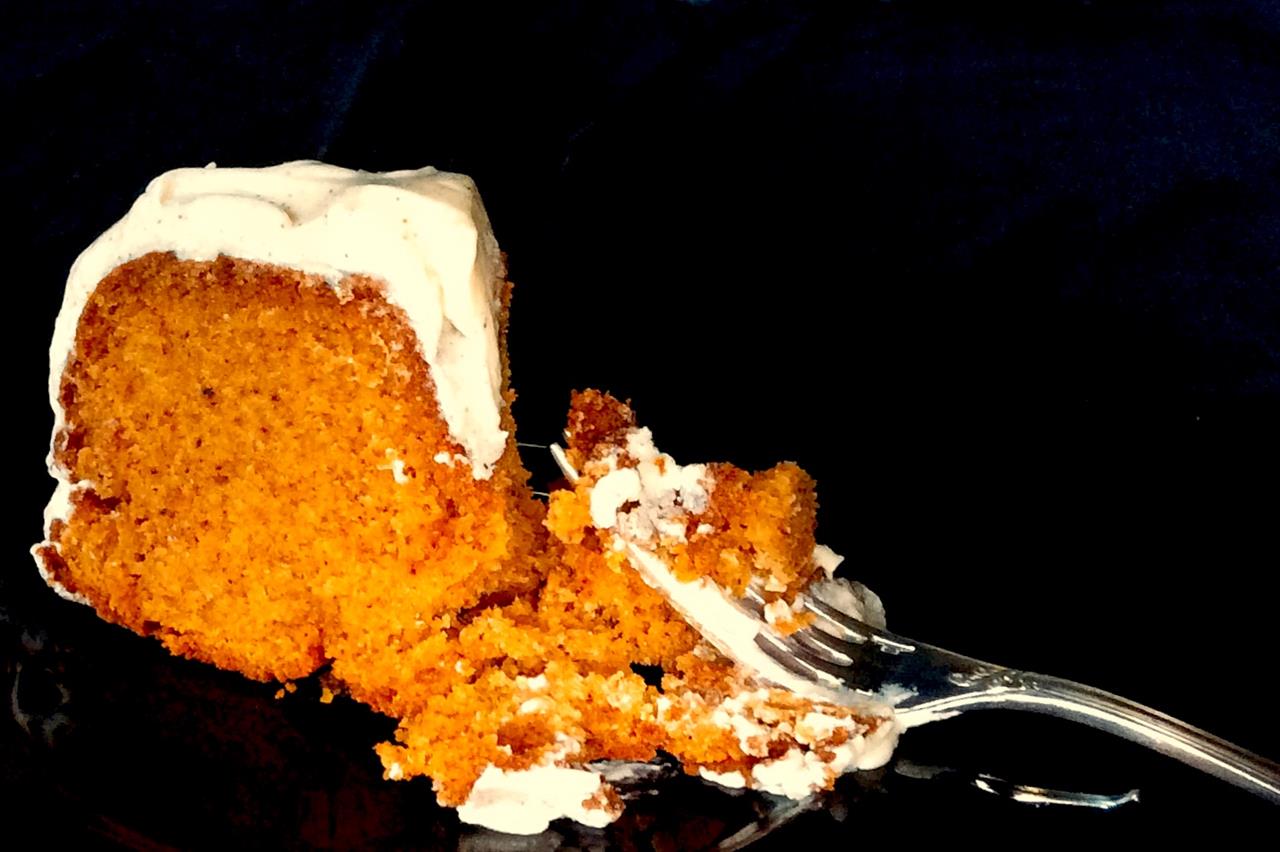 Πρώτη ετοιμάζουμε την κολοκύθα : κόβουμε μια μετρίου μεγέθους κολοκύθα στη μέση και με ένα κουτάλι αφαιρούμε τα σπόρια και τις ίνες. Στρώνουμε τη λαμαρίνα του φούρνου με αλουμινόχαρτο και δύο λαδόκολλες και τοποθετούμε τα δύο μισά της κολοκύθας με το κομμένο μέρος προς τα κάτω. Ψήνουμε σε προθερμασμένο φούρνο στους 180ο C στη λειτουργία του αέρα για 45΄- 60΄, μέχρι η κολοκύθα να μαλακώσει εντελώς. Μόλις κρυώσει λίγο, πολτοποιούμε την ψίχα στο μπλέντερ και κατόπιν τη βάζουμε σε ψιλή σήτα που στερεώνουμε σε ένα μπολ, ούτως ώστε να μαζέψει το περίσσιο υγρό. Όσο περισσότερο την αφήσουμε, τόσο πιο πολύ υγρό θα φύγει. Το βέλτιστο είναι να αφήσουμε να στεγνώσει ο πουρές για μια νύχτα στο ψυγείο. Για το κέικ θα χρειαστούμε 1 1/3 φλ. τσ. πουρέ. Μοιράζουμε τον υπόλοιπο σε σακουλάκια συντήρησης τροφίμων και τα βάζουμε στην κατάψυξη.