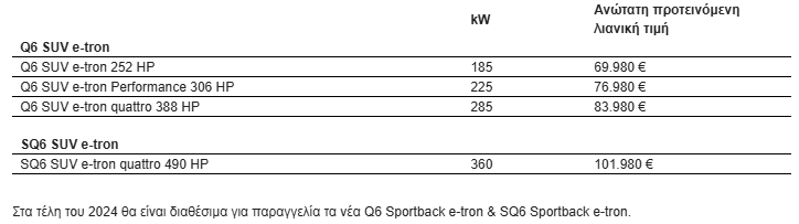 Τo νέο Q6 e-tron είναι διαθέσιμο στην ελληνική αγορά στις παρακάτω εκδόσεις και τιμές.