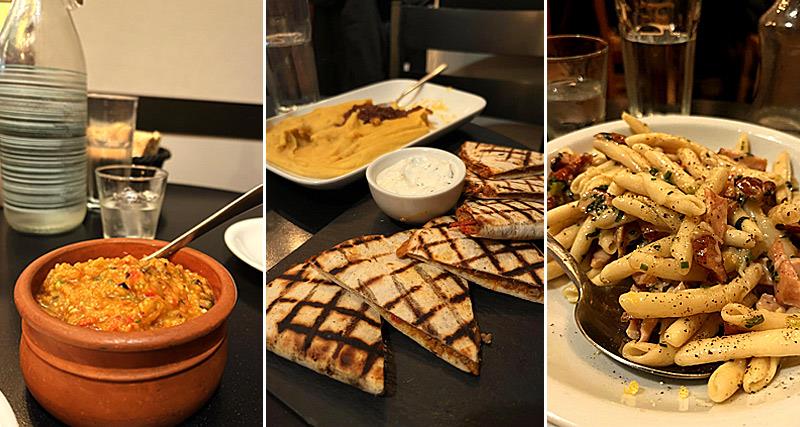 Ξεκινήσαμε με ένα φανταστικό ελληνοποιημένο ταμπουλέ (5,80€) με φέτα που ταίριαξε απροσδόκητα πολύ με τα γνωστά συστατικά του ορίτζιναλ (πληγούρι, ψιλοκομμένη ντοματούλα, αγγούρι και φρέσκα μυρωδικά) και μια χειροποίητη καπνιστή μελιτζανοσαλάτα (5€) του ονείρου, που ήρθε σε γενναιόδωρη ποσότητα σε ένα βαθύ πήλινο, ό,τι πρέπει για βούτες. Βελουδένια και ζεστή –πράγμα ιδιαζόντως σπάνιο για τα αθηναϊκά δεδομένα– ήρθε η φάβα (6€) με τα καραμελωμένα κρεμμύδια, που ήταν όντως καραμελωμένα και όχι απλά τσιγαρισμένα για πολύ ώρα ως είθισται.