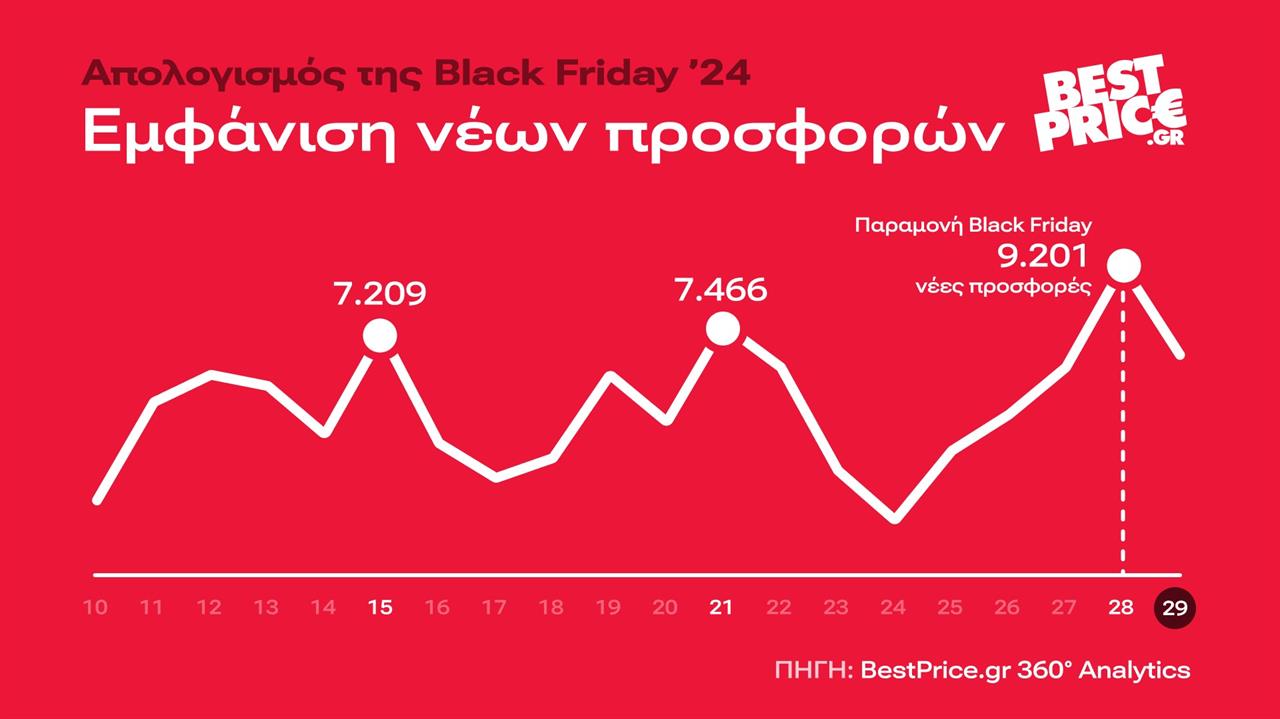 Τι προσφορές έφερε η Black Friday 2024 και πώς κινήθηκε το e-commerce στην Ελλάδα; Ποια προϊόντα μονοπώλησαν στα ηλεκτρονικά καλάθια, ποιες κατηγορίες παρουσίασαν ανοδική πορεία και σε τι τιμές τελικά αγόρασαν οι καταναλωτές, σύμφωνα με τα στατιστικά στοιχεία της Νο1 πλατφόρμας σύγκρισης τιμών BestPrice.gr.