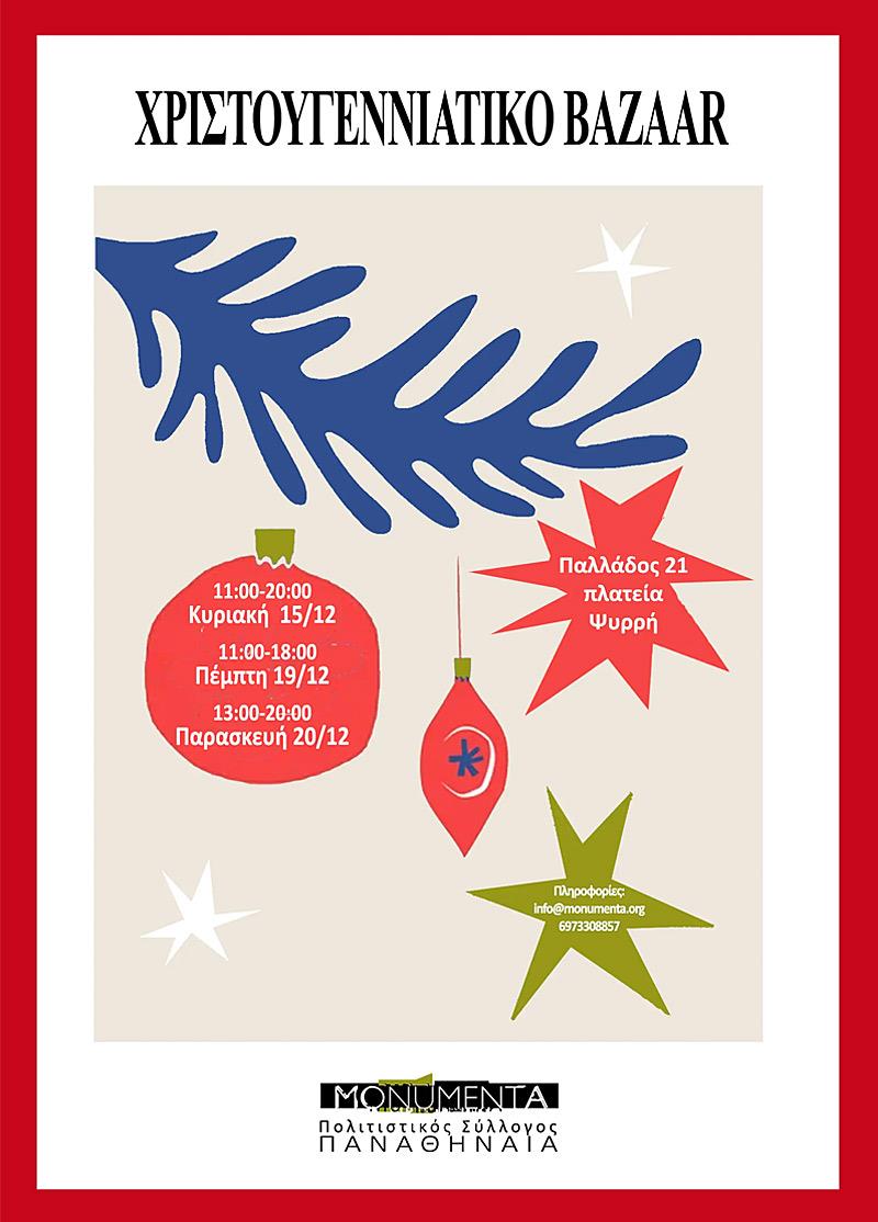 Η MONUMENTA και ο Πολιτιστικός Σύλλογος ΠΑΝΑΘΗΝΑΙΑ οργανώνουν, την Κυριακή 15 (11πμ-8μμ), την Πέμπτη 19 (11πμ-6μμ) και την Παρασκευή 20 (1μμ-8μμ) Δεκεμβρίου 2024, χριστουγεννιάτικο BAZAAR (στην οδό Παλλάδος 21, πλατεία Ηρώων, Ψυρρή) με πολλά προϊόντα (βιβλία, κεραμικά, κοσμήματα, παιχνίδια, ημερολόγια, πάνινες τσάντες, κούπες, σαπούνια, γλυκά κ.ά.) σε χαμηλές τιμές για γιορτινά δώρα που θα ενισχύσουν τη δράση τους.
