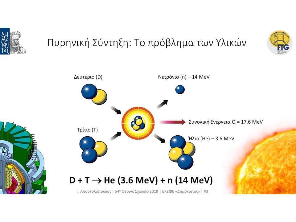 Η σύντηξη (Σχήμα 1) είναι μία διαδικασία κατά την οποία ελαφριοί πυρήνες (πχ Δευτέριο-D και Τρίτιο-T) ενώνονται, σε συνθήκες υψηλής θερμοκρασίας και πίεσης, για τη δημιουργία βαρύτερων και πιο σταθερών πυρήνων (πχ Ήλιο – He). Κατά τη διάρκεια της σύντηξης εκλύεται ενέργεια (px 3.6 MeV και 14 MeV).