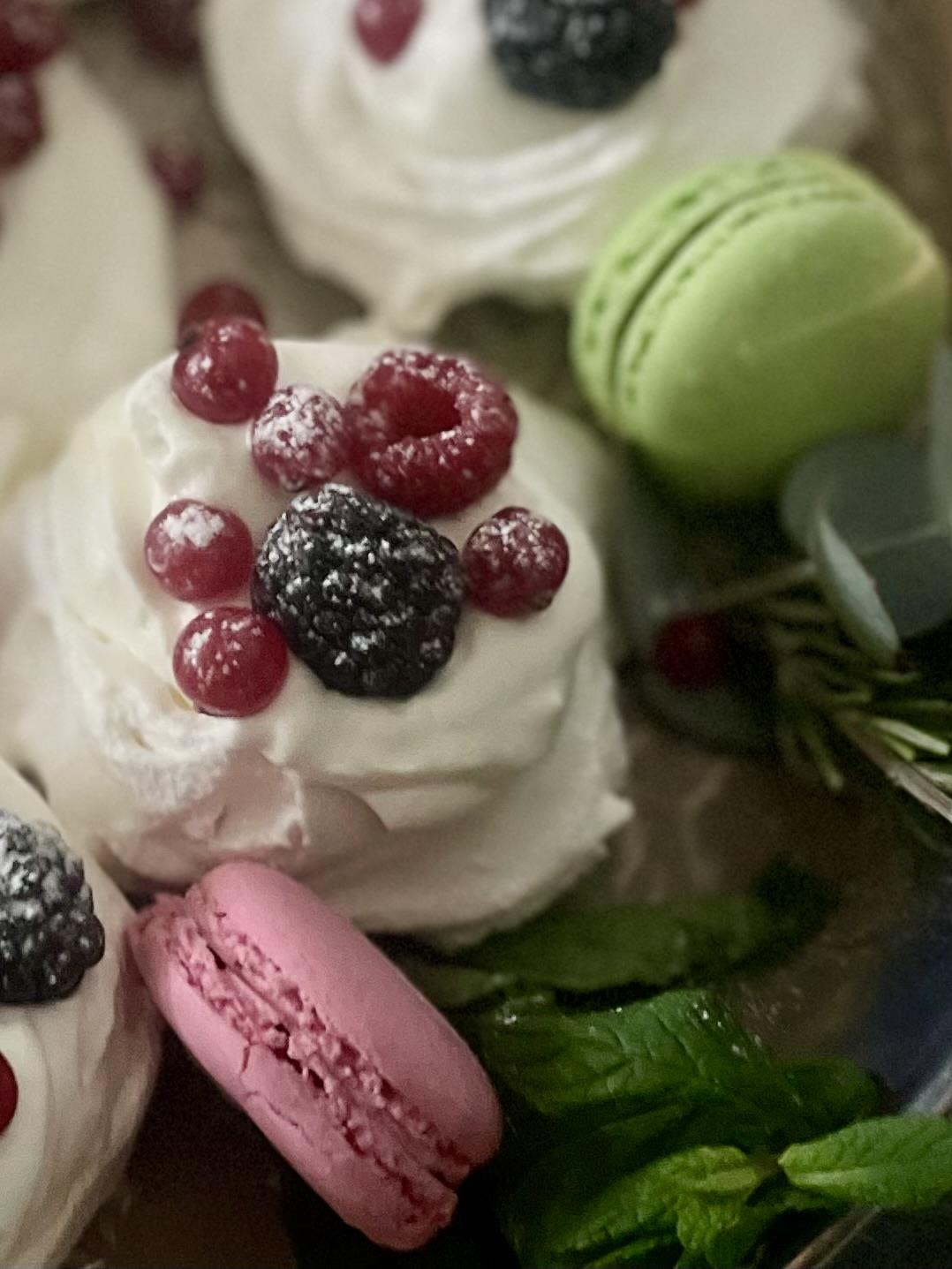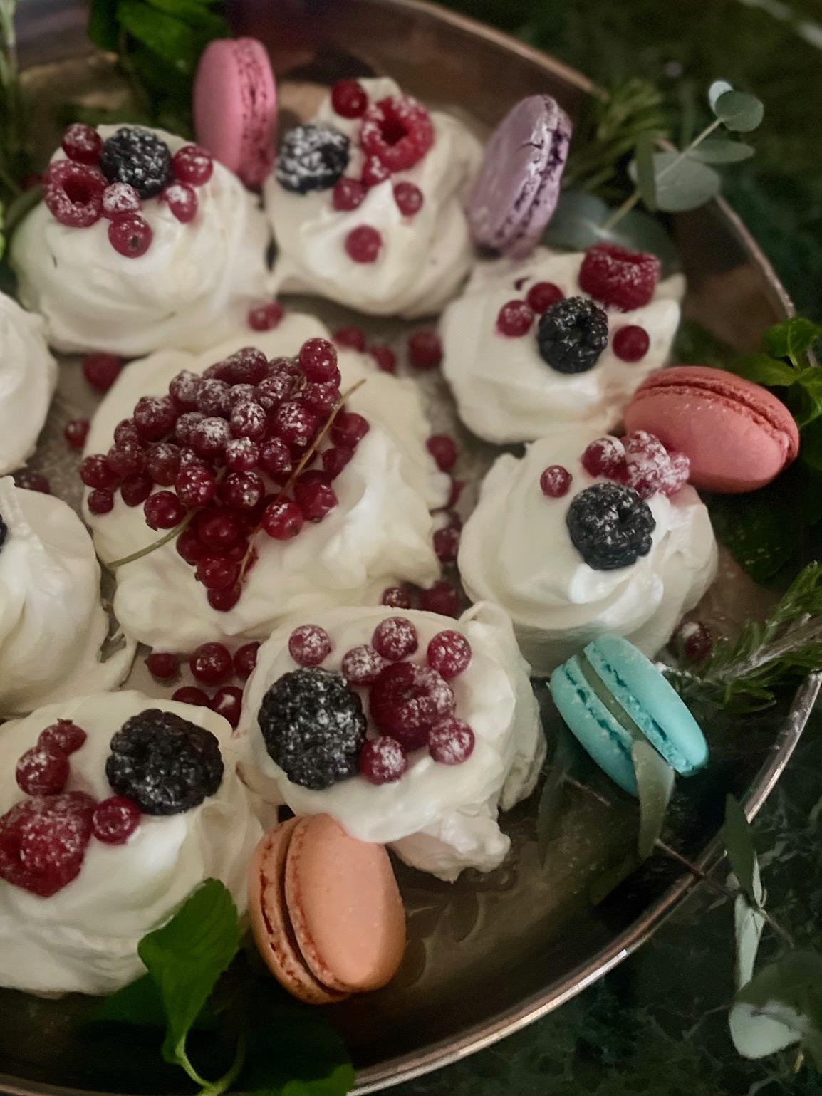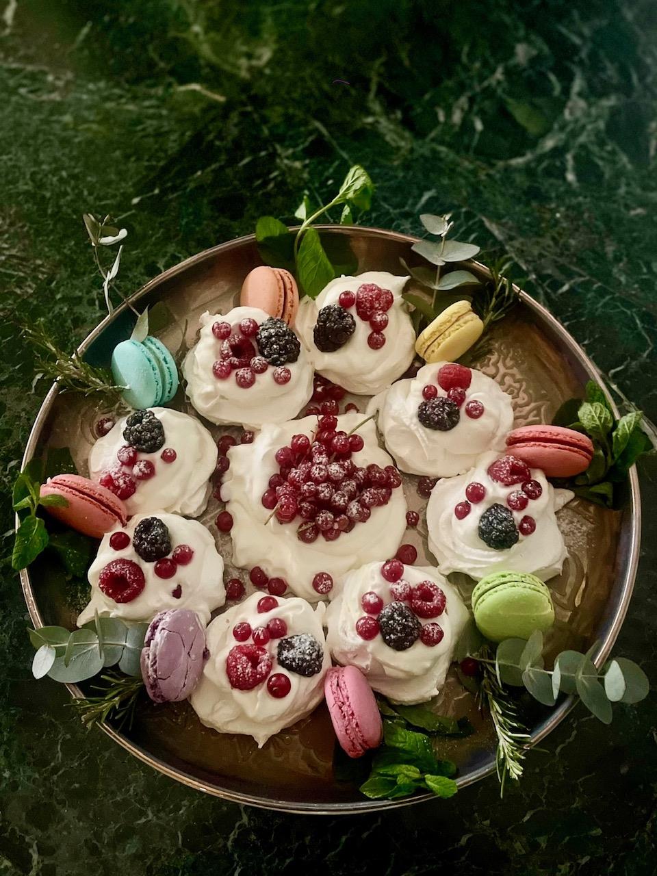 Σε μια στρογγυλή πιατέλα με χαμηλό γείσο ή σε ένα στρογγυλό ξύλο τοποθετούμε τις μαρέγκες κυκλικά να αγγίζουν σχεδόν η μία την άλλη και στη μέση βάζουμε άλλη μία. Στην κοιλότητα της κάθε μαρέγκας βάζουμε μία ή δύο κουταλιές κρέμα και από πάνω τοποθετούμε διάφορα φρούτα του δάσους (βλ. tips). Ενδιάμεσα από τις μαρέγκες τοποθετούμε κλωναράκια δενδρολίβανου ή/και φύλλα μέντας ή δυόσμου, καθώς και μακαρόν διαφόρων χρωμάτων και γεύσεων. Πασπαλίζουμε τα φρούτα με λίγη ζάχαρη άχνη και σερβίρουμε αμέσως.