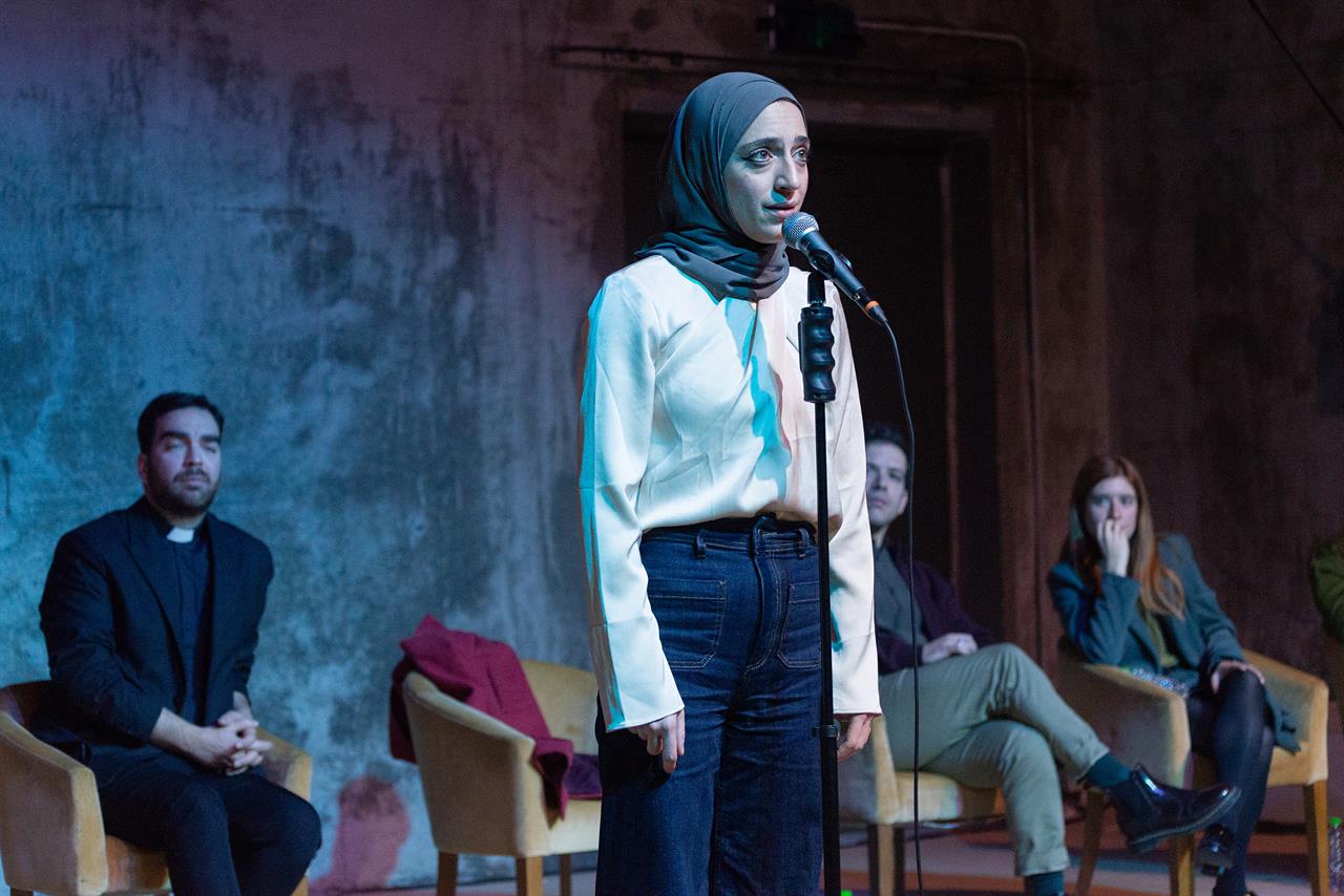 Όλες οι ερμηνείες είναι βαθιά δουλεμένες, και λειτουργούν άψογα σαν παζλ χαρακτήρων και προσεγγίσεων έτοιμο να εκραγεί –και θα εκραγεί, αν διαβάζεις προσεκτικά το έχεις μαντέψει ήδη. Η Ελευθερία Αγγελίτσα είναι σπαρακτικά καταιγιστική στον ρόλο της δημοσιογράφου Άστριντ Πήτερσεν, ενώ ο Πάρης Αλεξανδρόπουλος αποδίδει (και) με άγρια σωματικότητα τον πολιτικό αναλυτή Μάγκνους Τόμσεν και τις ακροδεξιές απόψεις του. Μαγικός στην κίνηση και την τρυφερή ερμηνεία του ο Βασίλης Τρυφουλτσάνης ως μαέστρος της Συμφωνικής Ορχήστρας της Δανίας Πασκουάλ Άντερσεν, εμπρηστικός ο Άρης Λάσκος ως Πατέρας Αυγουστίνος, και βαθιά εσωτερικοί ο Μάριος Μάνθος ως καθηγητής Ντάνιελ Κρίστενσεν και η Νίκη Χρυσοφάκη ως Ιρανή ποιήτρια Σιρίν Σιραζί. Ειλικρινείς στις προθέσεις τους ο Δημήτρης Μανδρινός ως φιλόσοφος-συγγραφέας Γκούσταβ Τζένσεν, και η Χρυσή Μπαχτσεβάνη ως Έμμα Σμιτ-Πούλσεν, πρώην τηλεπερσόνα και νυν πρόεδρος φιλανθρωπικού οργανισμού και σύζυγος του Πρωθυπουργού της Δανίας.