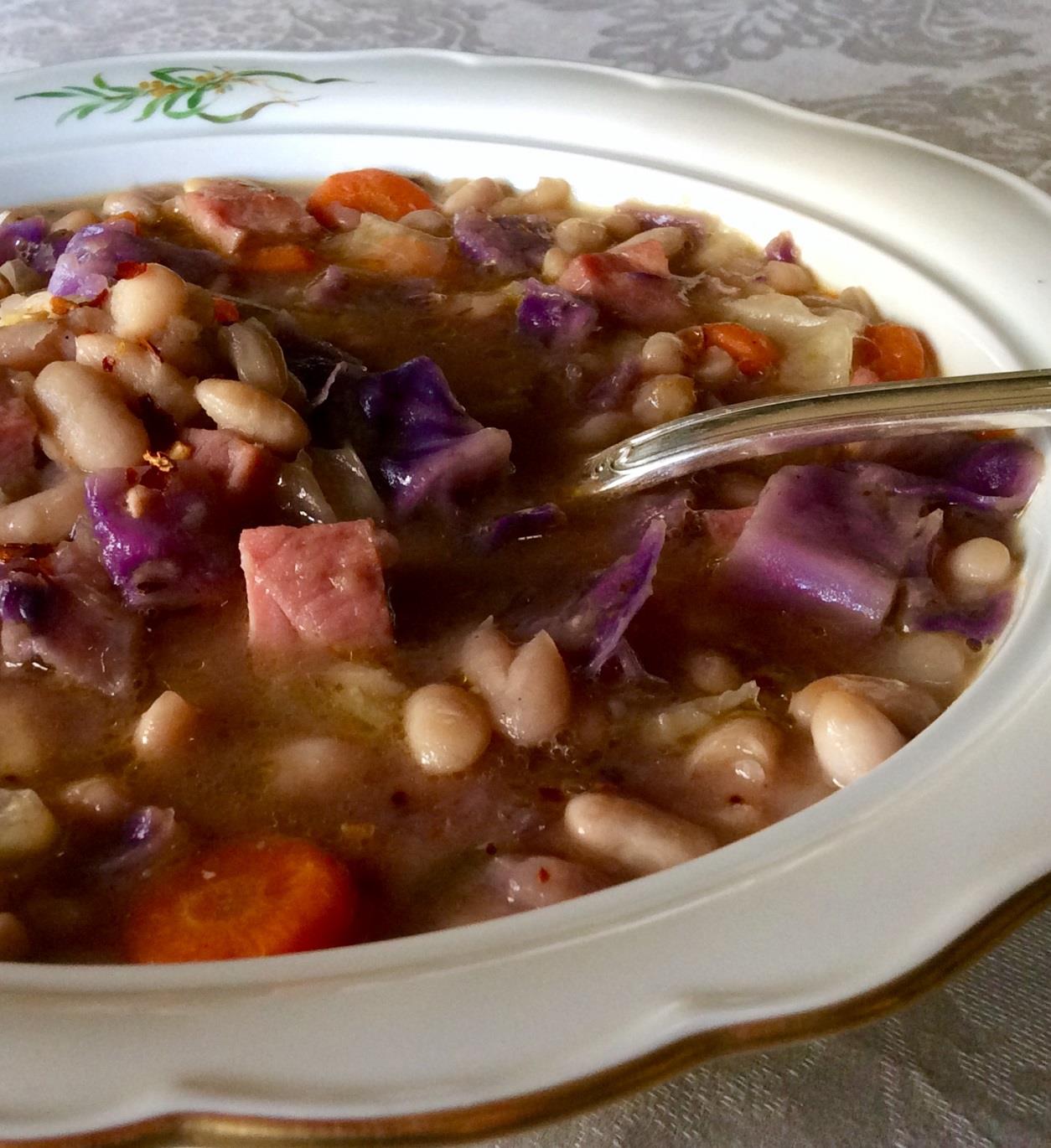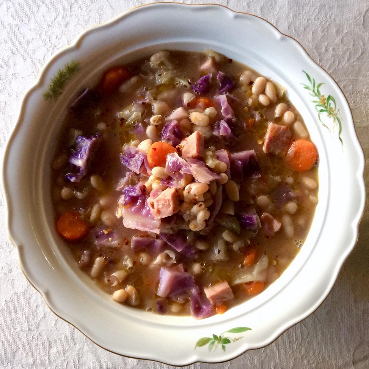 Ζεσταίνουμε λίγο ελαιόλαδο σε κατσαρόλα με χοντρό πάτο και σοτάρουμε ελαφρά μία χοντρή φέτα καπνιστού ζαμπόν (πάχους περίπου 1,5 εκ.) που έχουμε κόψει σε κύβους. Μόλις το ζαμπόν πάρει χρώμα (χωρίς βεβαίως να ξεροψηθεί), το αφαιρούμε με τρυπητή κουτάλα και στη θέση του σοτάρουμε 1 μεγαλούτσικο κρεμμύδι ψιλοκομμένο, 2 μέτρια καρότα κομμένα σε ροδέλες και 1 κλαρί σέλερι ψιλοκομμένο. Μόλις τα λαχανικά μαλακώσουν χωρίς να πάρουν χρώμα, προσθέτουμε 1 σκ. σκόρδου ψιλοκομμένη και σοτάρουμε για λίγα δευτερόλεπτα ακόμη. Προσθέτουμε 250 γρ. φασόλια που έχουμε προβράσει μέχρι να μαλακώσουν και πριν να χυλώσουν, αλατοπίπερο και 1 ή 2 πρέζες μπούκοβο και σκεπάζουμε με σπιτικό ζωμό βοδινού ή κότας ή λαχανικών. Βράζουμε σε χαμηλή φωτιά με μισοσκεπασμένη την κατσαρόλα, για όση ώρα χρειαστεί μέχρι τα φασόλια να χυλώσουν, ενώ, εάν διαπιστώσουμε ότι χρειάζεται κι άλλο υγρό, συμπληρώνουμε σταδιακά με λίγο βραστό νερό. Προσθέτουμε το ζαμπόν, ½ μετρίου μεγέθους κόκκινο λάχανο κι άλλο τόσο λευκό, κομμένα σε λωρίδες. και μαγειρεύουμε για λίγο ακόμη μέχρι να μαλακώσουν τα λάχανα, χωρίς να λιώσουν (γύρω στο δεκάλεπτο). Διορθώνουμε το αλατοπίπερο και σερβίρουμε τη σούπα καυτή με λίγο έξτρα μπούκοβο εάν θέλουμε και, επίσης προαιρετικά, λίγη τριμμένη παρμεζάνα.