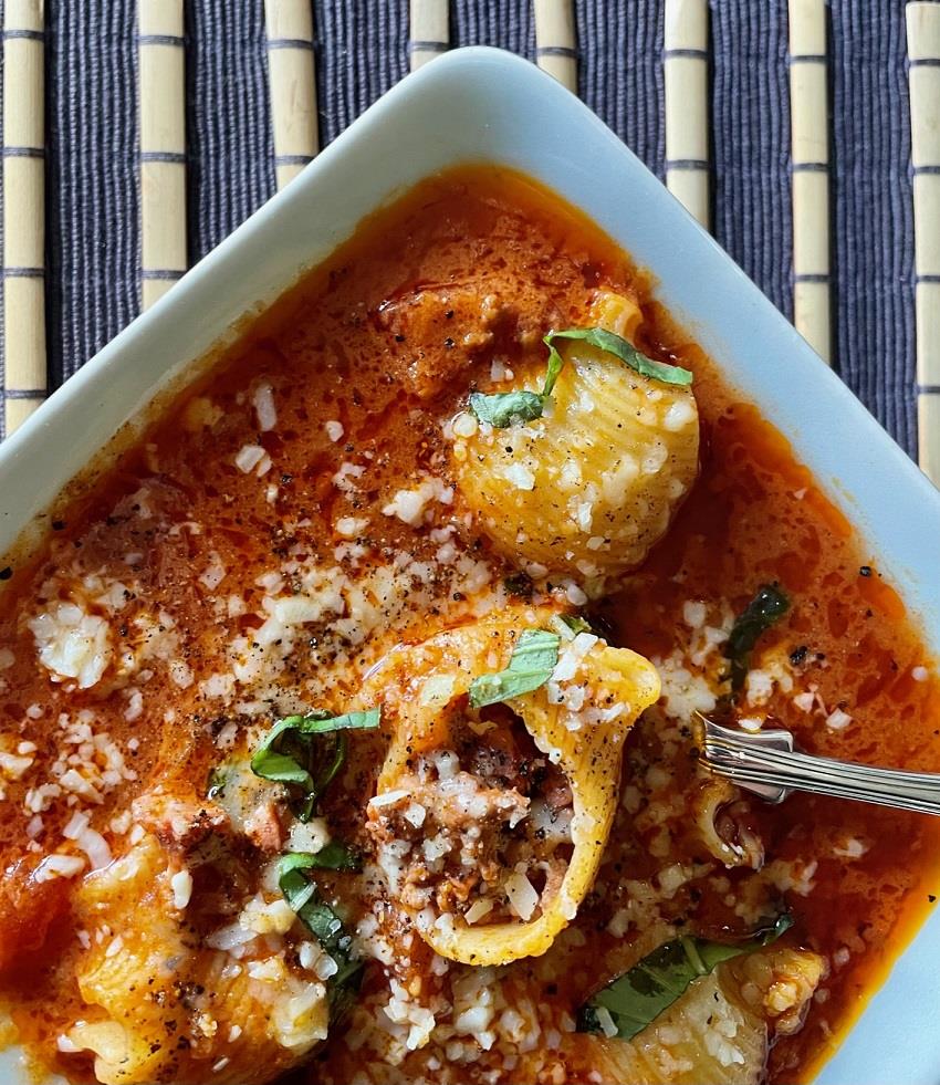 Κόβουμε σε πολύ μικρά καρέ (μικρότερα και από το νύχι του μικρού μας δαχτύλου) 1 μεγάλο ξερό κρεμμύδι, 1 μέτριο καρότο και 1 κλαρί σέλερι. Καθαρίζουμε και πολτοποιούμε με το ειδικό εργαλείο ή κόβουμε πολύ ψιλά 1 σκ. σκόρδου. Αφαιρούμε την εξωτερική μεμβράνη από 250 γρ. χωριάτικα λουκάνικα και ψιλοκόβουμε τη σάρκα τους σαν κιμά (βλ. tips). Ψιλοκόβουμε 2 κονσέρβες ολόκληρα αποφλοιωμένα ντοματάκια και κρατάμε και τον χυμό. Σε μία μεγάλη κατσαρόλα με χοντρό πάτο σοτάρουμε σε λίγο ελαιόλαδο και σε μέτρια προς δυνατή φωτιά το κρεμμύδι, το καρότο και το σέλερι. Τα βοηθάμε με λίγο αλάτι για να βγάλουν τα υγρά τους και να μαλακώσουν, χωρίς να πάρουν χρώμα. Προσθέτουμε 1 κ.σ. πελτέ ντομάτας και προαιρετικά 1-2 κ.γλ. μπούκοβο κατά βούληση (βλ. tips). Συνεχίζουμε το σοτάρισμα μέχρι να σκουρύνει ο πελτές. Προσθέτουμε το σκόρδο και σοτάρουμε για ελάχιστα λεπτά, μέχρι να μυρίσει. Προσθέτουμε 500 γρ. μοσχαρίσιο κιμά (βλ. tips) και τον κιμά από τα λουκάνικα. Σοτάρουμε μέχρι να «σπάσει» ο κιμάς, να γίνει σπυρωτός και να μην έχει καθόλου υγρά. Αλατοπιπερώνουμε. Σβήνουμε με 1 ποτήρι του νερού λευκό ξηρό κρασί και ανακατεύουμε. Μόλις εξατμισθεί το αλκοόλ προσθέτουμε τα ψιλοκομμένα ντοματάκια και τον χυμό τους. Για να πάρουμε όλον τον χυμό από τις κονσέρβες τις γεμίζουμε με βραστό νερό και το προσθέτουμε στα υπόλοιπα υλικά. Συμπληρώνουμε με 1 κονσέρβα τριμμένης ντομάτας (passata). Τέλος, προσθέτουμε 1 φλ. τσ. πλήρες αγελαδινό γάλα. Χαμηλώνουμε τη φωτιά και σιγοβράζουμε με την κατσαρόλα ανοιχτή για τουλάχιστον μιάμιση ώρα. Μπορεί κατά διαστήματα να χρειάζεται να συμπληρώνουμε με βραστό νερό, με τελικό σκοπό να υπάρχει αρκετό υγρό για να βράσουν τα ζυμαρικά στο επόμενο στάδιο. Επίσης, καλό είναι να δοκιμάζουμε για να δούμε εάν χρειάζεται να συμπληρώσουμε αλάτι, υπολογίζοντας δύο παράγοντες: ο πρώτος είναι τα ζυμαρικά που κανονικά βράζουμε σε άφθονο αλατισμένο νερό αλλά που σε αυτή τη συνταγή βράζουν μέσα στη σούπα (βλ. tips) και ο δεύτερος το τριμμένο τυρί που θα μπει στο τέλος. Μόλις η σούπα έχει την επιθυμητή υφή γι’ αυτή τη φάση, δηλ. είναι ακόμη λίγο αραιή, προσθέτουμε 250 γρ. κοντά ζυμαρικά (βλ. tips) και τα μαγειρεύουμε μέχρι να μαλακώσουν αλλά, συγχρόνως, προσέχουμε για να μείνουν πραγματικά al dente γιατί θα συνεχίσουν να μαγειρεύονται κι όταν βγάλουμε την κατσαρόλα από την φωτιά. Δοκιμάζουμε για να δούμε εάν χρειάζεται να διορθώσουμε τη γεύση. Μοιράζουμε την καυτή σούπα σε μπολ, πασπαλίζουμε με τριμμένο τυρί (βλ. tips) και προσθέτουμε φρέσκο ψιλοκομμένο βασιλικό και λίγο φρεσκοτριμμένο πιπέρι.