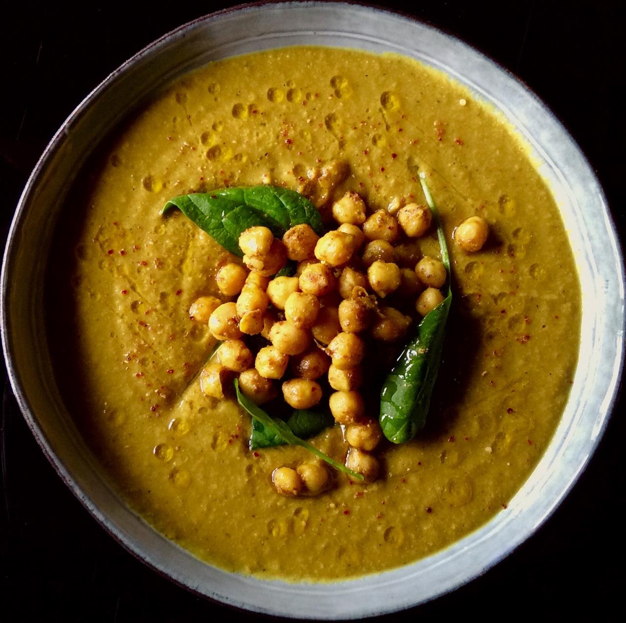 Ζεσταίνουμε καλά μια κατσαρόλα με βαρύ πάτο, προσθέτουμε λίγο ελαιόλαδο ή λάδι καρύδας ή λάδι από σιναπόσπορο (βλ. tips) και σοτάρουμε 1 ξερό κρεμμύδι ψιλοκομμένο, 1 κομμάτι ginger ψιλοκομμένο ή τριμμένο, 1 κ.γλ. κουρκουμά, 1 κ.σ. κάρυ και μια πρέζα μπούκοβο ή chili ή πιπέρι cayenne. Μόλις μυρίσουν τα μπαχαρικά προσθέτουμε 1 σκ. σκόρδου ψιλοκομμένη και σοτάρουμε για λίγο ακόμη, μέχρι να κάνουν ωραία εξωτερική κρούστα. Τα αφαιρούμε με τρυπητή κουτάλα από το σκεύος και τα αφήνουμε προς το παρόν στην άκρη. Στη θέση τους βάζουμε 350 γρ. ρεβίθια που έχουμε προβράσει μέχρι να μαλακώσουν και πριν να χυλώσουν και τα σοτάρουμε μέχρι να πάρουν ωραίο χρώμα. Βγάζουμε 2 χούφτες ρεβίθια και τα αφήνουμε στην άκρη για το γαρνίρισμα του φαγητού. Επιστρέφουμε στην κατσαρόλα τα σοταρισμένα λαχανικά και σκεπάζουμε τα υλικά με βραστό νερό. Χαμηλώνουμε την ένταση της εστίας και σιγοβράζουμε τα ρεβίθια μέχρι να χυλώσουν τέλεια. Αν χρειαστεί, προσθέτουμε σταδιακά λίγο νερό. Περνάμε τα υλικά της σούπας στον μύλο των λαχανικών για να απομακρύνουμε τις φλούδες των ρεβιθιών (βλ. tips). Δοκιμάζουμε για να διορθώσουμε, αν χρειαστεί, το αλατοπίπερο και μοιράζουμε τη σούπα στα μπολ. Γαρνίρουμε με λίγα φύλλα νεαρού σπανακιού, τα ρεβίθια που κρατήσαμε στην άκρη και 1 κουταλιά γιαούρτι. Μπορούμε επίσης να στάξουμε και λίγες σταγόνες λεμονιού. Τέλος, ραντίζουμε με σταγόνες ελαιολάδου και προαιρετικά, πασπαλίζουμε με λίγο έξτρα καυτερό πιπέρι (το ίδιο που χρησιμοποιήσαμε στην αρχή).