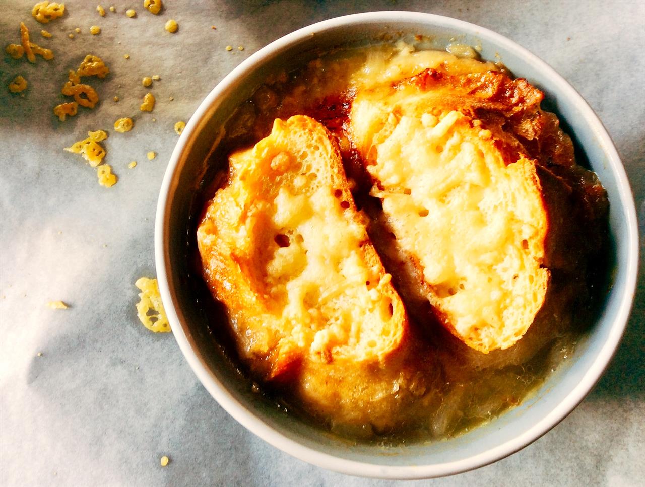 Καθαρίζουμε 6 μεγαλούτσικα λευκά ή κίτρινα κρεμμύδια που έχουν ηπιότερη γεύση από αυτή των κοινών κόκκινων. Τα κόβουμε σε σχετικά λεπτά μισοφέγγαρα. Σε μία κατσαρόλα με χοντρό πάτο λιώνουμε σε μέτρια προς χαμηλή φωτιά 50 γρ. βούτυρο, προσθέτουμε τα κρεμμύδια, τα αλατίζουμε για να βγάλουν τα υγρά τους και τα σοτάρουμε μέχρι να μαλακώσουν λίγο, ανακατεύοντάς τα συνεχώς, για περίπου 10΄-15΄. Ανεβάζουμε την ένταση της φωτιάς σε μέτρια και συνεχίζουμε το σοτάρισμα μέχρι τα κρεμμύδια να γίνουν εντελώς διαφανή και να καραμελώσουν ελαφρώς (περίπου άλλα 15΄). Σβήνουμε με 1 ποτηράκι λευκό ξηρό κρασί και 1 σφηνάκι κονιάκ. Συνεχίζουμε, ανακατεύοντας συχνά, μέχρι να εξατμιστεί το αλκοόλ και τα κρεμμύδια να μείνουν σχεδόν χωρίς υγρά Προσθέτουμε 2 λίτρα ζωμό βοδινού, αλατοπιπερώνουμε και σιγοβράζουμε τη σούπα για περίπου 30΄-40΄, μέχρι η ποσότητα να μειωθεί σε περίπου 1,5 λίτρο. Διορθώνουμε το αλατοπίπερο και σβήνουμε το μάτι της κουζίνας. Στο μεταξύ έχουμε ανάψει το γκριλ του φούρνου. Μοιράζουμε τη σούπα σε πυρίμαχα μπολ, προσθέτουμε από 1 κ.σ. χοντροτριμμένο τυρί, από πάνω τοποθετούμε 1 ή 2 φέτες ψωμιού (βλ. tips), τις πασπαλίζουμε με λίγο έξτρα τυρί και γκρατινάρουμε στον φούρνο μέχρι να χρυσίσει το ψωμί και να λιώσει το τυρί. Σερβίρουμε πολύ ζεστή.