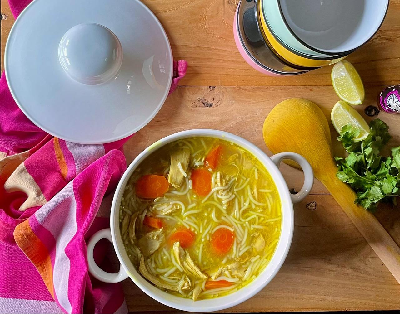 Σε μία κατσαρόλα βάζουμε 2 κρεμμύδια κομμένα στα τέσσερα, 2 σκ. σκόρδου κομμένες στα δύο, ένα μεγάλο κομμάτι ginger ίσο με μισή παλάμη περίπου, κομμένο σε φέτες (δεν χρειάζεται να το ξεφλουδίσουμε), 1 μεγάλο κομμάτι κουρκουμά ιδίου μεγέθους με το ginger, κομμένο σε φέτες (ούτε αυτό χρειάζεται να το ξεφλουδίσουμε – βλ. tips), τα κοτσάνια από ένα μάτσο φρέσκο κόλιανδρο (κρατάμε τα φύλλα για το σερβίρισμα), 1 κ.γλ. σπόρους κόλιανδρου, 1 κ.γλ. κόκκους μαύρου πιπεριού, 2 κ.γλ. χοντρό αλάτι, 1 μοσχολέμονο (lime) κομμένο στα δύο και ένα κοτόπουλο κομμένο σε κομμάτια, με την πέτσα και τα κόκκαλα. Σκεπάζουμε με κρύο νερό, φέρνουμε σε βρασμό, ξαφρίζουμε μέχρι να σταματήσει το άφρισμα, χαμηλώνουμε την εστία σε μέτρια και βράζουμε μέχρι το κοτόπουλο να μαγειρευτεί και το κρέας να φεύγει από τα κόκκαλα. Αφαιρούμε τα κομμάτια του κοτόπουλου και τα αφήνουμε να χλιάνουν. Αφαιρούμε την πέτσα και τα κόκκαλα και κόβουμε το ψαχνό σε μικρά κομμάτια με τα δάχτυλά μας. Τα αφήνουμε στην άκρη. Περνάμε τον ζωμό από ψιλή σήτα, απομακρύνουμε τα στερεά υλικά και τον ξαναβάζουμε στην κατσαρόλα (βλ. tips). Προσθέτουμε 4 καρότα κομμένα σε ροδέλες και τα βράζουμε στον ζωμό μέχρι να μαλακώσουν. Προσθέτουμε τα κομμάτια του κοτόπουλου και 150 γρ. noodles ρυζιού και βράζουμε για λίγο ακόμη μέχρι να μαλακώσουν τα noodles (βλ. tips). Δοκιμάζουμε και, εάν χρειαστεί, διορθώνουμε το αλάτι και προσθέτουμε τον χυμό από 1 μοσχολέμονο. Μοιράζουμε τη σούπα σε μπολ, προσθέτουμε προαιρετικά λίγες σταγόνες καυτερής σος (βλ. tips), γαρνίρουμε με φύλλα φρέσκου κόλιανδρου και στο πλάι βάζουμε έξτρα φέτες μοσχολέμονου. Απολαμβάνουμε τη σούπα καυτή.