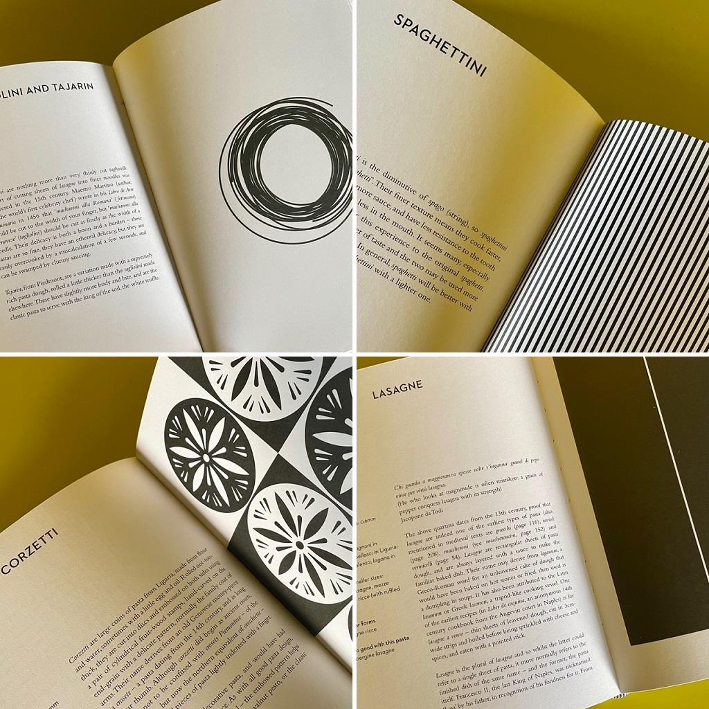 Ένα πανέξυπνο και πανέμορφο βιβλίο με όλα τα γνωστά, τα λιγότερο γνωστά και κάποια παντελώς άγνωστα σε μας σχήματα ζυμαρικών όπου στο κάθε σχήμα αντιστοιχούν συγκεκριμένοι τρόποι μαγειρέματος και συγκεκριμένες σάλτσες, με σκοπό την απόλαυση ενός από τα πιο αγαπημένα φαγητά στον κόσμο όλο. Η ιδέα για το βιβλίο ανήκει στον γραφίστα Gaz Hildebrand ο οποίος χρειάστηκε πάνω από πέντε χρόνια για να καταλήξει στη φόρμα των σχεδίων του. Εκτός από ένα ιταλικό βιβλίο γαστρονομίας του 1891, ο καλλιτέχνης εμπνεύστηκε και από έναν κατάλογο υδραυλικών δακτυλίων! Θεώρησε – και το έξοχο αποτέλεσμα τον δικαιώνει – πως τα αυστηρά γεωμετρικά ασπρόμαυρα σχέδια αποτυπώνουν με τον καλύτερο τρόπο τις διαφορές μεταξύ των σχημάτων και βοηθούν στο να οριστούν οι κατάλληλες, για κάθε σχήμα, σάλτσες και συνταγές.
