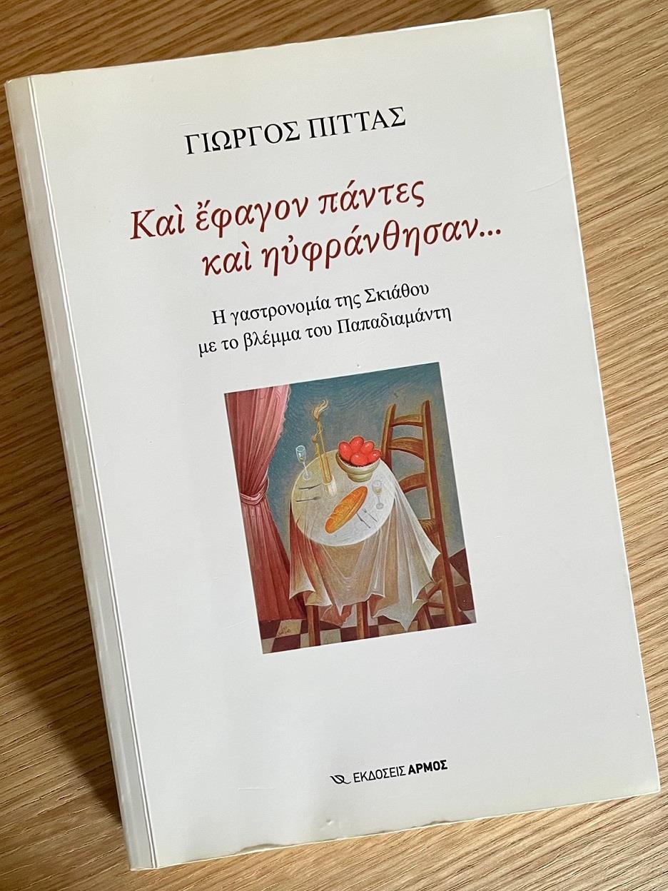 Όπως υποδεικνύει ο υπότιτλος του ξεχωριστού αυτού βιβλίου «Η Γαστρονομία της Σκιάθου με το βλέμμα του Παπαδιαμάντη» και όπως αναφέρει ο συγγραφέας στον πρόλογο, δεν υπάρχει τόπος στην Ελλάδα που να ταυτίστηκε τόσο πολύ με έναν λογοτέχνη του, όπως η Σκιάθος με τον Παπαδιαμάντη. Κι όπως, επίσης σωστά, γράφει παρακάτω, ενστερνιζόμενος τον ορισμό της γαστρονομίας του πιο διάσημου Γάλλου γαστρονόμου Μπριγιά-Σαβαρέν, το έργο του οποίου ‘Physiologie du Goût’ αποτελεί την βίβλο κάθε ανθρώπου για τον οποίο η γαστρονομία σημαίνει απείρως περισσότερα και σημαντικότερα πράγματα από το φαγητό και τη μαγειρική, στα βιβλία του Παπαδιαμάντη βρίσκουμε τον γαστρονομικό οδηγό της Σκιάθου της εποχής του.