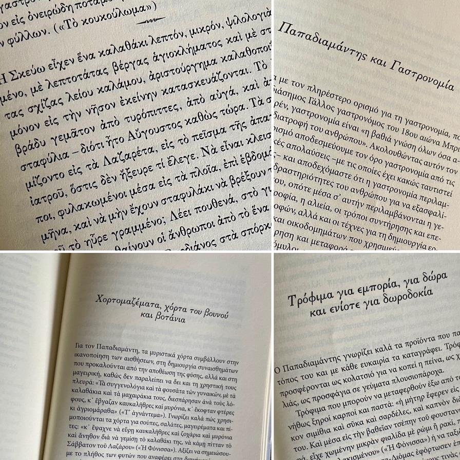 Μέσα στα 300 αποσπάσματα από 90 διηγήματα του μεγάλου Σκιαθίτη που διάλεξε ο ακάματος εξερευνητής και γευσιγνώστης της ελληνικής γαστρονομίας Γιώργος Πίττας, πρώτα και κύρια συνδεόμαστε και πάλι με τη γλώσσα του Παπαδιαμάντη, μια γλώσσα δική του, που ακόμα κι αν δεν καταλαβαίνουμε κάθε της λέξη (παρόλα αυτά στο τέλος του βιβλίου υπάρχει γλωσσάρι), είναι τέτοια η ορμή, ο αυθορμητισμός και ο πλούτος της που έχει, ακόμα και σήμερα, τη δύναμη να μας συγκινεί βαθιά. Με την ίδια συγκίνηση συνδεόμαστε με έναν κόσμο που δεν υπάρχει πια και με έναν τόπο που η δική μου γενιά ίσα που πρόλαβε να γνωρίσει, ενώ θα παραμείνει εν πολλοίς άγνωστος στις νέες γενιές.