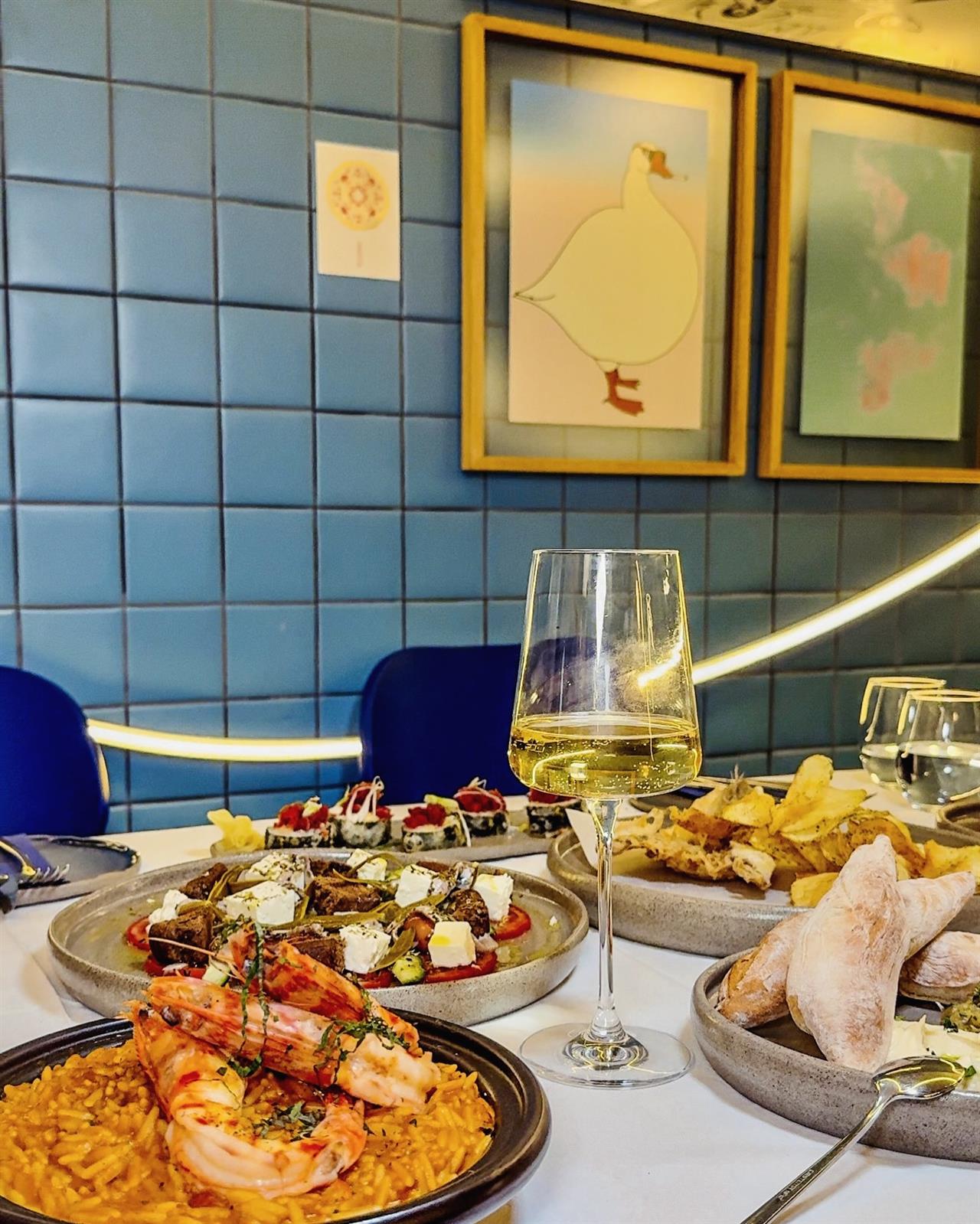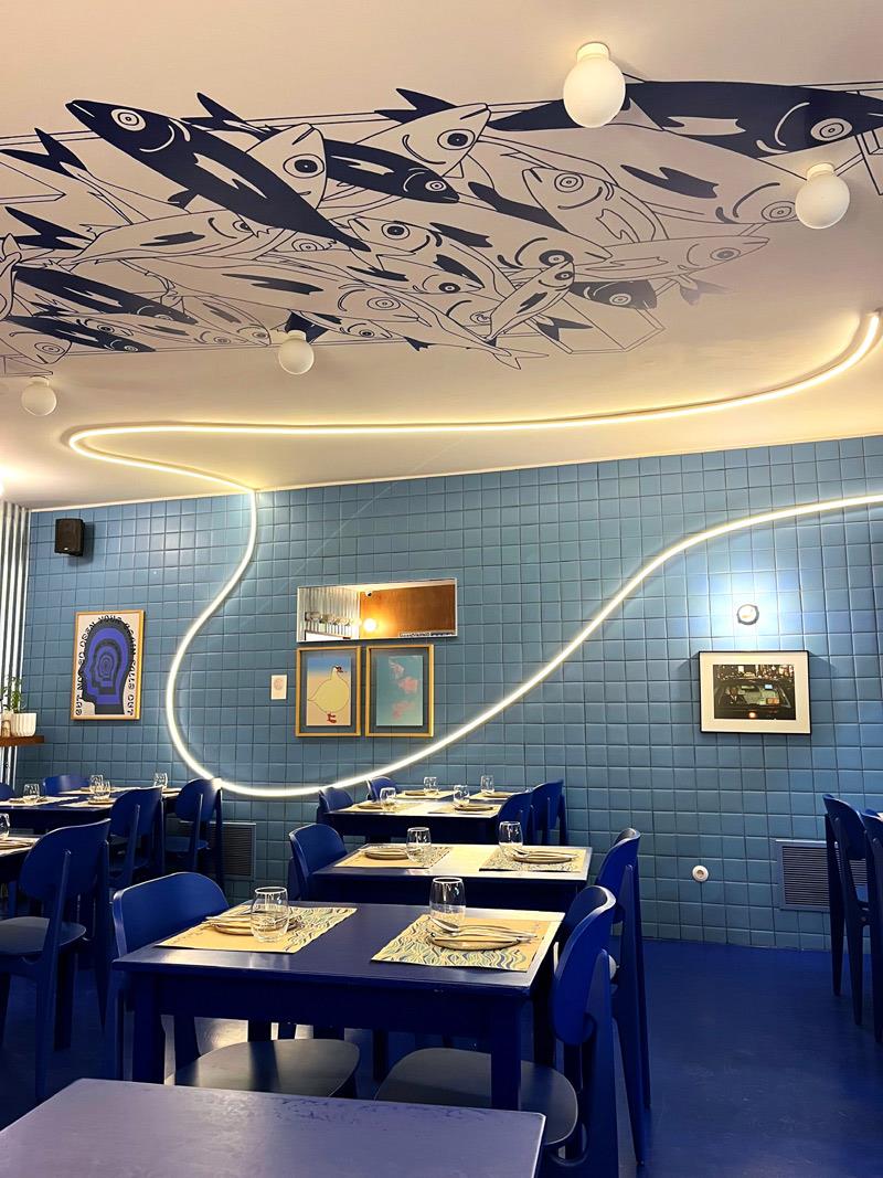 Φάνκι και φιλόξενο και απολύτως μπλε, από τα βαθυγάλαζα πατώματα μέχρι τις καρέκλες του και το γαλαζωπό πλακάκι στους τοίχους, τους οποίους στολίζει με μπριόζικα έργα τέχνης (η πάπια που καπνίζει είναι το αγαπημένο μας) το Manu υπόσχεται να γίνει στέκι, σε μια γειτονιά που στέκια έχει πολλά, εστιατόρια για ψάρι και θαλασσινά σχεδόν καθόλου.