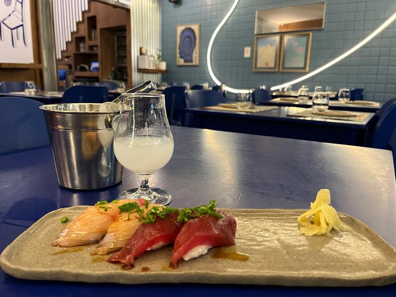 Συνεχίζουμε δυναμικά με sushi (12€ τα τέσσερα τεμάχια) που έρχονται σε ρολάκια ανάποδα από εκείνα που έχεις συνηθίσει, επάνω ένα γενναίο κομμάτι ψαριού (εμείς πετύχαμε τόνο και λαβράκι) κάτω το ρύζι, συν σάλτσα nikiri, λεμόνι, φρέσκο κρεμμύδι και λεπτοκομμένο τζίντζερ στην άκρη του πιάτου για να αλλάζει η γεύση ανάμεσα στις μπουκιές. Άψογα εκτελεσμένα, κερδίζουν ομόφωνα τις εντυπώσεις.