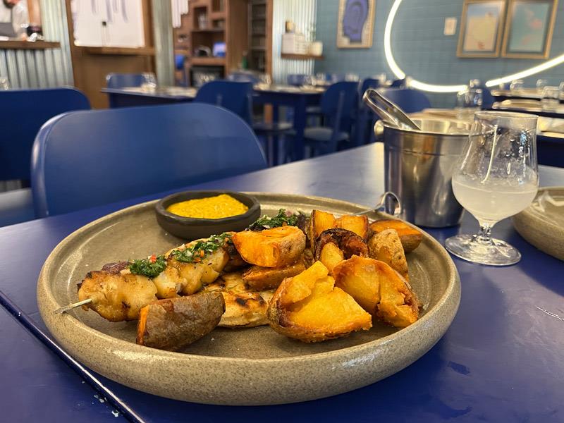 Η συνέχεια είχε Tiradito (16€) κι αυτό με ψάρι ημέρας, γκρέιπφρουτ, λάϊμ, λεμόνι, πορτοκάλι, κρέμα κάσιους, τραγανό κάσιους και πολύ ιδιαίτερο μέλι κουμαριάς. Κάθε μπουκιά και μια αναπάντεχη, αλλά τόσο ταιριαστή συμφωνία γεύσεων που σκάει σαν μουσική στο στόμα. Κλείσαμε με καταπληκτικό σουβλάκι (18€) με πεσκανδρίτσα, chimichurri, teriyaki, σερβιρισμένο με παραδοσιακά ελληνικά πιτάκια και τραγανά και πολύ ενδιαφέροντα βραχάκια πατάτας. Μοναδική ένσταση η σως μουστάρδας που τα συνόδευε, και η οποία αποδείχθηκε (με τον δύσκολο τρόπο, ενός μικρού δακρύου που έτρεξε) πολύ πιο καυτερή από τα γούστα μας.