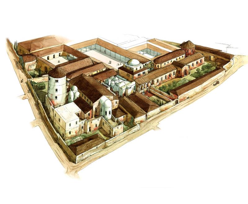 Το Κτήριο Ε, στο κέντρο της ανασκαφής, μια έπαυλη 5.000 τετραγωνικών μέτρων, όπως ήταν όταν χτίστηκε, τον 6ο αιώνα μ.Χ. Δεν ξέρουμε σε ποιον ανήκε, σίγουρα πάντως ήταν κάποιος με πλούτο και εξουσία.