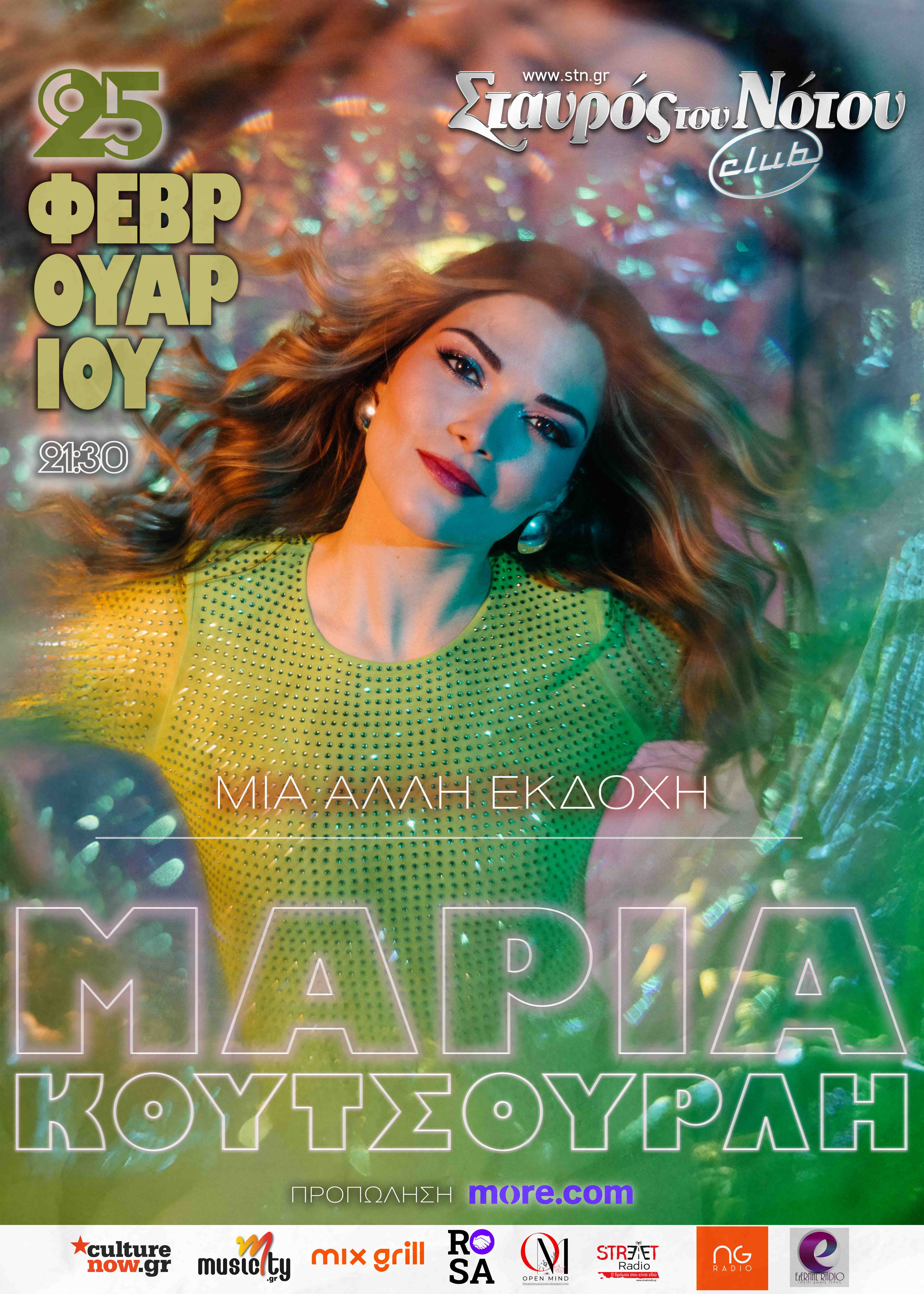 Η Μαρία Κουτσουρλή μας προσκαλεί σε ένα μοναδικό live την Τρίτη 25 Φεβρουαρίου στον Σταυρό του Νότου, παρουσιάζοντας μας τραγούδια από το πρώτο της προσωπικό album με τίτλο «Μια άλλη εκδοχή» αλλά και πρωτότυπες διασκευές αγαπημένων της τραγουδιών.