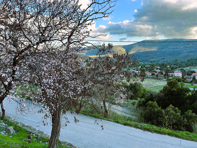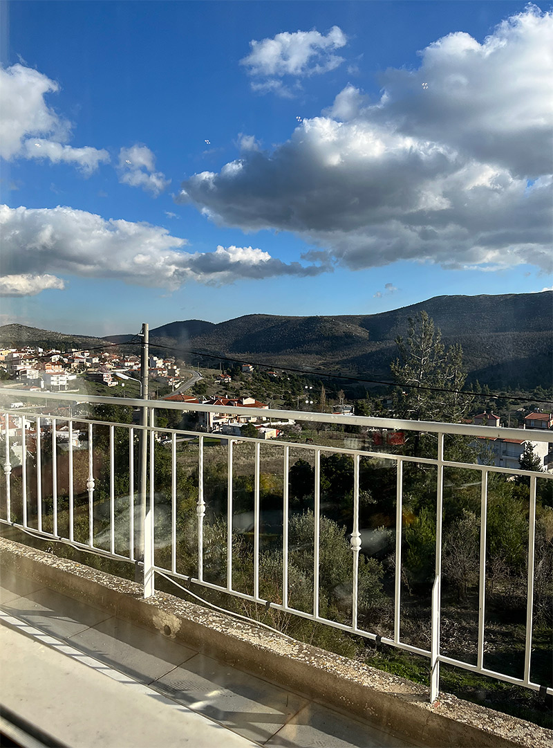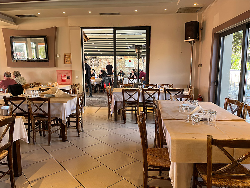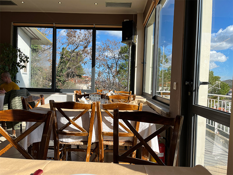 Καταρχάς να σου πούμε, όταν πάρεις τηλέφωνο για κράτηση (αρκετά απαραίτητη τα Σαββατοκύριακα, το μυστικό έχει διαρρεύσει και τα πλήθη συρρέουν) να ζητήσεις ένα από τα τραπέζια πλάι στη μεγάλη τζαμαρία, που έχουν σούπερ θέα στο απέραντο βαθυπράσινο του βουνού, το οποίο κάνει ωραία αντίθεση με τις κεραμιδένιες στέγες του χωριού.