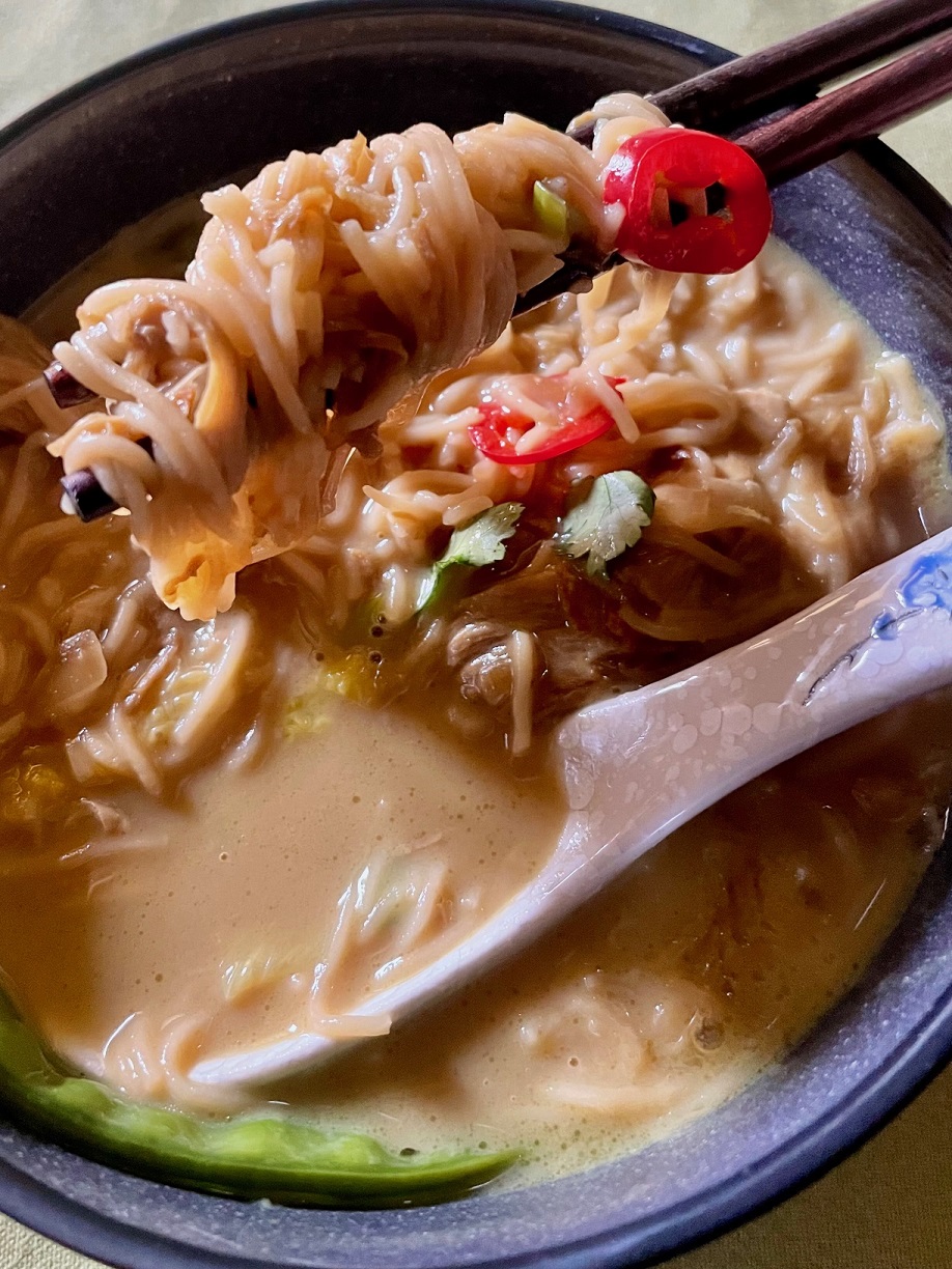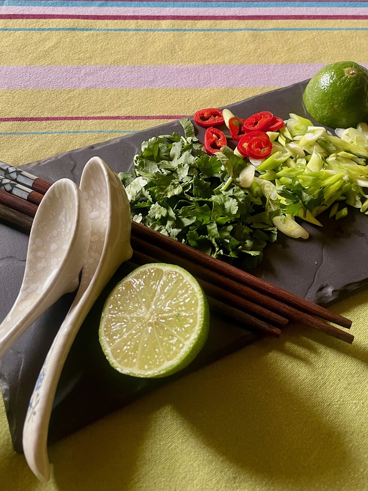 Όση ώρα βράζει η σούπα ετοιμάζουμε τα συνοδευτικά: ψιλοκομμένα φρέσκα κρεμμυδάκια, limes, φρέσκο κόλιανδρο, καυτερές πιπερίτσες chili και, εάν έχουμε, νωπές φύτρες σόγιας ή άλλες φύτρες π.χ. σκόρδου, παντζαριού, κ.λπ. Σκέφτομαι ότι θα ταιριάζουν και τα baby καλαμπόκια που βρίσκουμε σε βάζο ή και οι φύτρες μπαμπού σε κονσέρβα (και τα δύο στα ράφια των σουπερμάρκετ με ethnic προϊόντα).