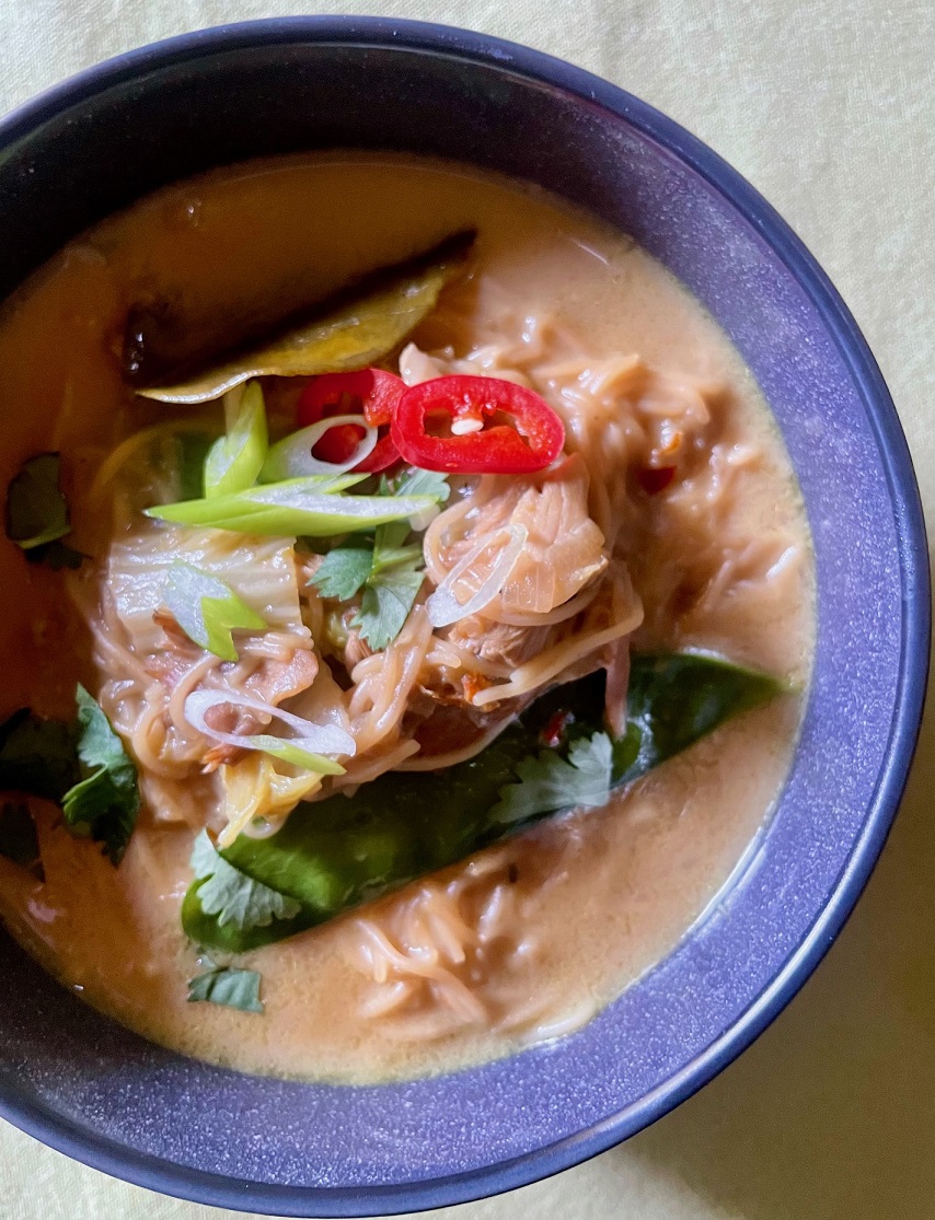 Σε κατσαρόλα ζεσταίνουμε λίγο λάδι καρύδας (ή ελαιόλαδο) και σοτάρουμε 1 μεγάλο κρεμμύδι ψιλοκομμένο, ένα κομμάτι ginger ίσο περίπου με το μεγάλο μας δάχτυλο τριμμένο στον λεπτό τρίφτη, ένα ίδιου μεγέθους κομμάτι κουρκουμά τριμμένο κι αυτό στον λεπτό τρίφτη (αν δεν έχουμε νωπό αντικαθιστούμε με 1 κ.γλ. σκόνη), 1-2 νωπές πιπερίτσες chili ψιλοκομμένες (ή λίγο μπούκοβο), 1 κ.γλ. σπόρους γλυκάνισου και 1 κ.γλ. σπόρους μάραθου. Μόλις μαλακώσει το κρεμμύδι και γίνει διάφανο προσθέτουμε 1 σκ. σκόρδου τριμμένη στον λεπτό τρίφτη ή πολτοποιημένη με το ειδικό εργαλείο και, μόλις μυρίσει και το σκόρδο, προσθέτουμε 2 lt σπιτικό ζωμό λαχανικών ή κότας, το ψαχνό από 1 στήθος κοτόπουλου ή από 2 μπούτια κομμένο σε μικρά κομμάτια (το κοτόπουλο που είχα ήταν μπούτια που έβρασαν πρώτα για τον ζωμό και για τις δύο σούπες και κατόπιν το ψαχνό τους για αυτήν), 1 κ.σ. fish sauce, 1 κ.σ. soy sauce, 1 μπαστούνι λεμονόχορτο (lemongrass) αφού του αφαιρέσουμε το εξωτερικό φύλλο και το κόψουμε στα τρία, 2 φύλλα kaffir lime και 1 κοφτή κ.σ. ζάχαρη καρύδας (βλ. tips).