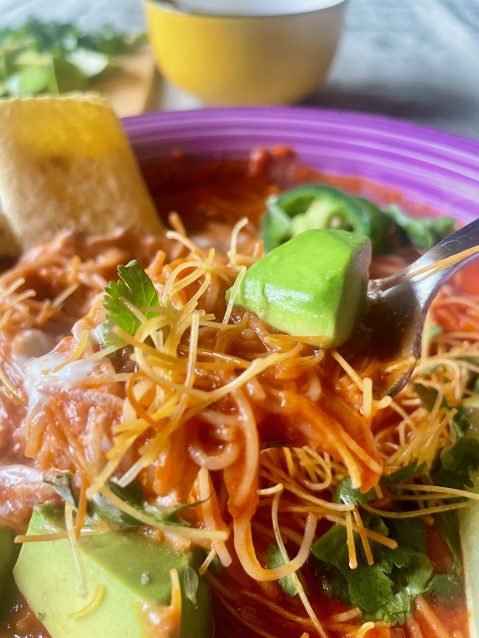 Όση ώρα μαγειρεύουμε τη σούπα, ετοιμάζουμε τα συνοδευτικά: αβοκάντο, καυτερές πιπεριές (chili ή jalapenos), limes, φρέσκο κόλιανδρο, μαλακές tortillas ή τραγανά tacos ή nachos, ξινή κρέμα (sour cream) ή smetana (η αντίστοιχη ρώσικη ξινή κρέμα) ή, ελλείψει και των δύο, γιαούρτι, καθώς και τον καβουρδισμένο φιδέ που κρατήσαμε στην άκρη.
