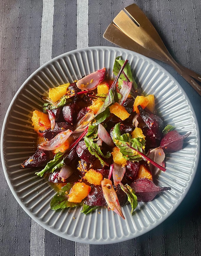 Όση ώρα ψήνονται τα λαχανικά ετοιμάζουμε το dressing ανακατεύοντας με το σύρμα λίγη μουστάρδα, ξίδι από κόκκινο κρασί, λίγο κύμινο σε σκόνη, ξύσμα και χυμό πορτοκαλιού, αλατοπίπερο και εξαιρετικό παρθένο ελαιόλαδο. Κόβουμε 1 πορτοκάλι σε μικρά κομμάτια και το προσθέτουμε στο μπολ με τα παντζάρια και τα κρεμμύδια. Περιχύνουμε με το dressing, γαρνίρουμε με λίγα από τα πιο τρυφερά φύλλα των παντζαριών και απολαμβάνουμε τη σαλάτα σε θερμοκρασία δωματίου.