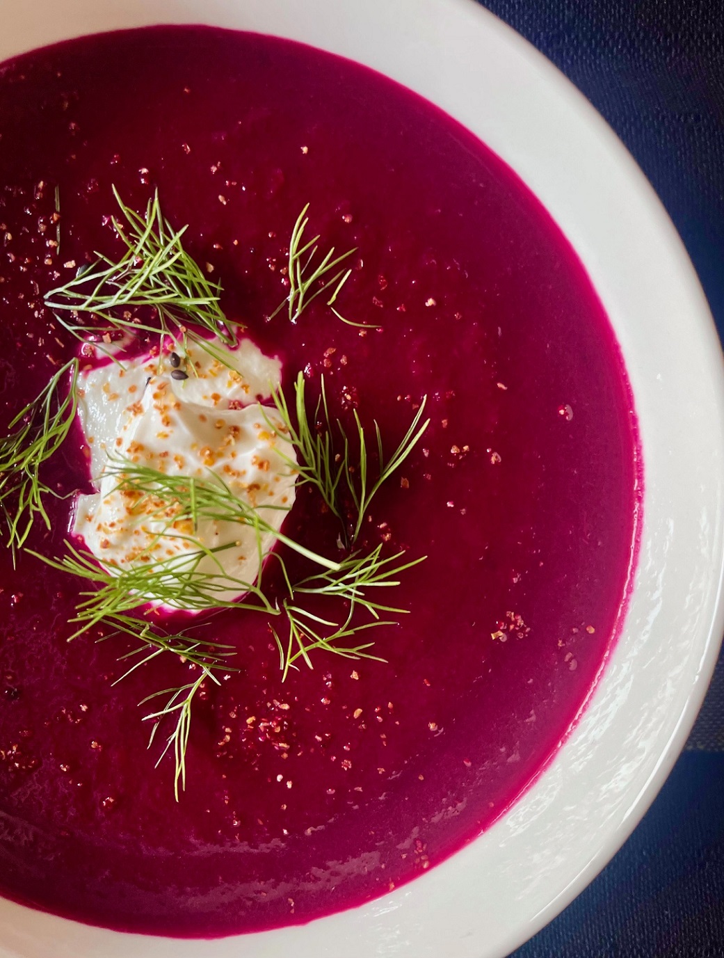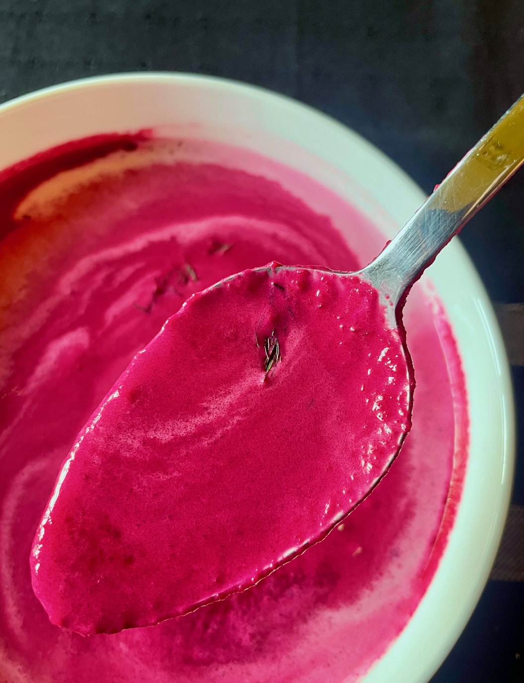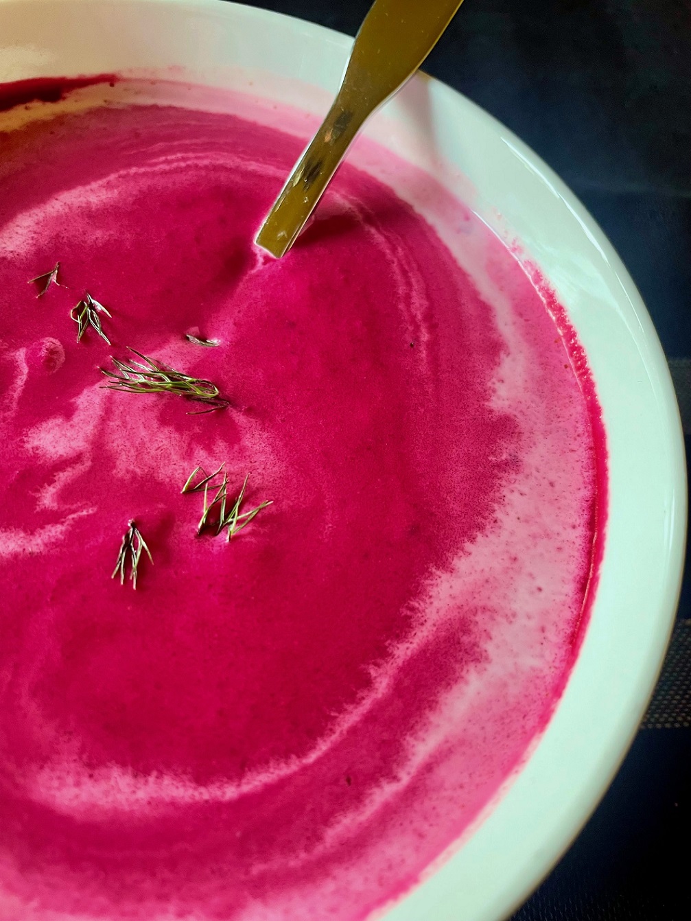 Σε κατσαρόλα ζεσταίνουμε λίγο ελαιόλαδο και σοτάρουμε ένα μεγάλο ξερό κρεμμύδι χοντροκομμένο, ένα κομμάτι τζίντζερ περίπου σαν το μεγάλο μας δάχτυλο κομμένο σε λεπτές φέτες ή τριμμένο στον χοντρό τρίφτη, ½ κ.γλ. πιπέρι καγιέν (ή τσίλι που καίει λίγο λιγότερο), 1 κ.γλ. σκόνη κόλιανδρο και 1 κ.γλ. μαραθόσπορους ελαφρώς κοπανισμένους. Μόλις το κρεμμύδι γίνει διάφανο και μυρίσουν τα μπαχαρικά προσθέτουμε 1 μεγάλη πατάτα κομμένη σε κύβους, ένα ξινόμηλο κομμένο σε κύβους και τα ψημένα παντζάρια. Αλατοπιπερώνουμε. Σκεπάζουμε με σπιτικό ζωμό λαχανικών ή κότας. Χαμηλώνουμε τη φωτιά και σιγοβράζουμε για περίπου 30΄, μέχρι να μαλακώσει εντελώς η πατάτα. Προς το τέλος προσθέτουμε τον χυμό από ένα μεγάλο πορτοκάλι και ένα μοσχολέμονο (lime). Πολτοποιούμε και διορθώνουμε τη γεύση.