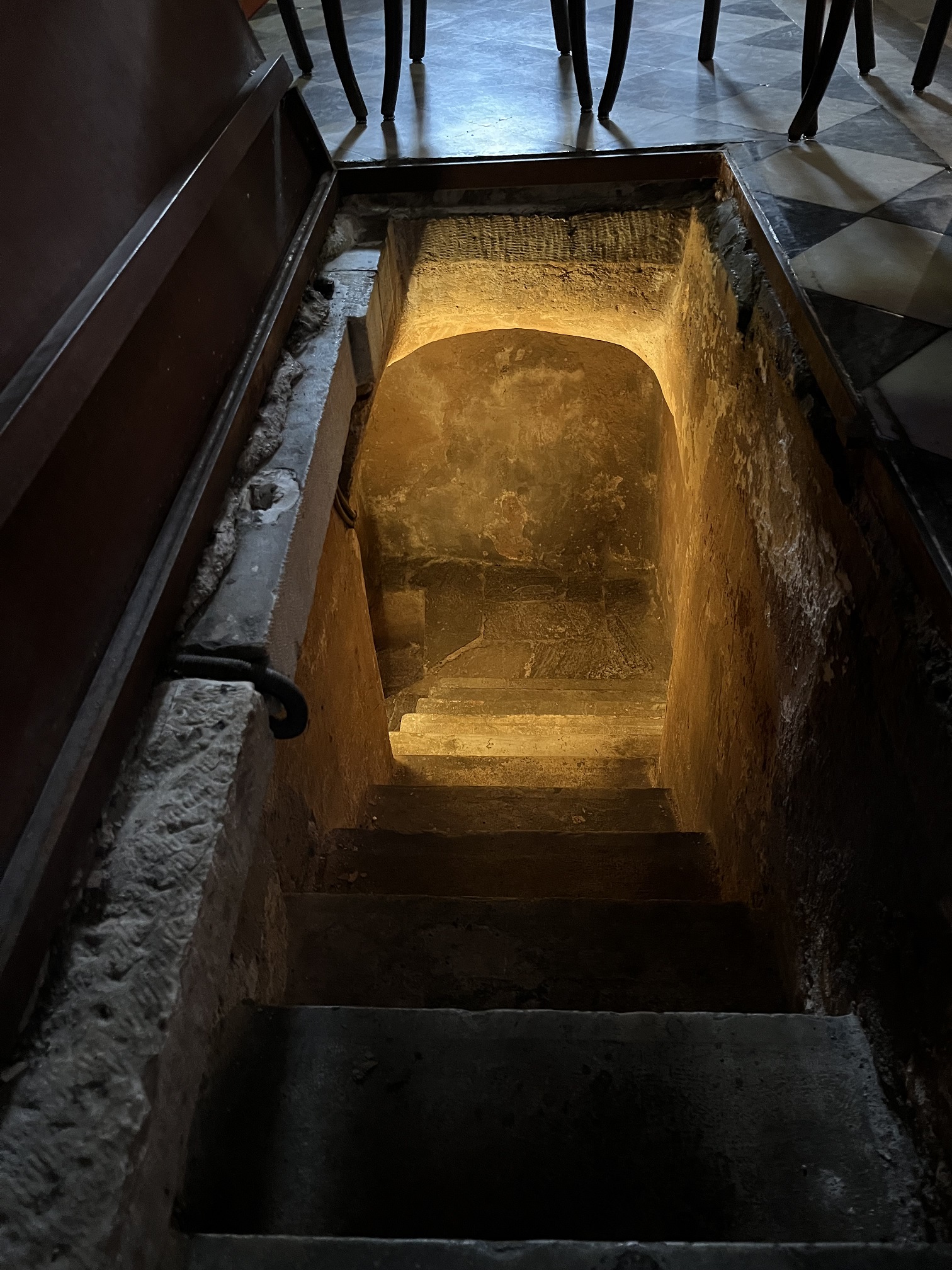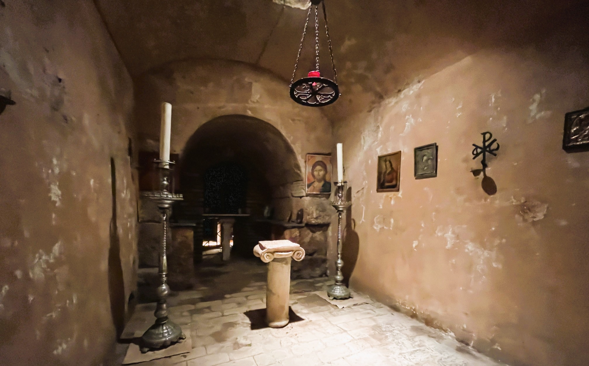 Η κυρίως αίθουσα αυτού που ήταν άλλοτε τα ρωμαϊκά λουτρά μετατράπηκε το 1870 στο παρεκκλήσι του Αγίου Στεφάνου, όπου πραγματοποιείται ακόμα μέχρι σήμερα μια φορά τον μήνα ο Εσπερινός, στην ιδιαίτερα κατανυκτική ατμόσφαιρα που ενισχύει η τοποθεσία του κάτω από την γη. Δίπλα του, μια εσοχή στον τοίχο οδηγεί σε ένα πηγάδι που χρονολογείται από τα βυζαντινά χρόνια –ο κλειστοφοβικά στενός διάδρομος που οδηγεί σε αυτό δεν είναι επισκέψιμος, για λόγους ασφαλείας, το επιτόπιο ρεπορτάζ μας ωστόσο επιβεβαιώνει πως έχει ακόμα κανονικότατα νερό.
