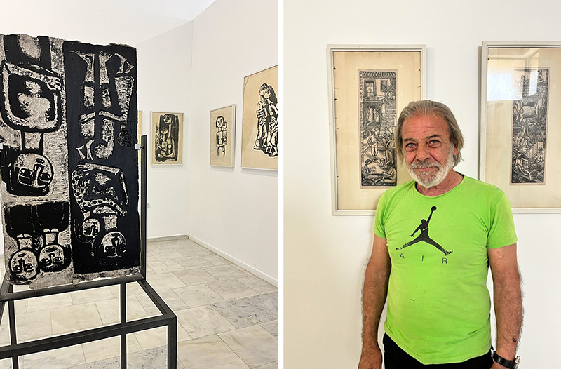 Δεξιά, ο Σωτήρης Γερμανός πλάι στο έργο της Βάσως Κατράκη που απεικονίζει τον ίδιο και την οικογένειά του