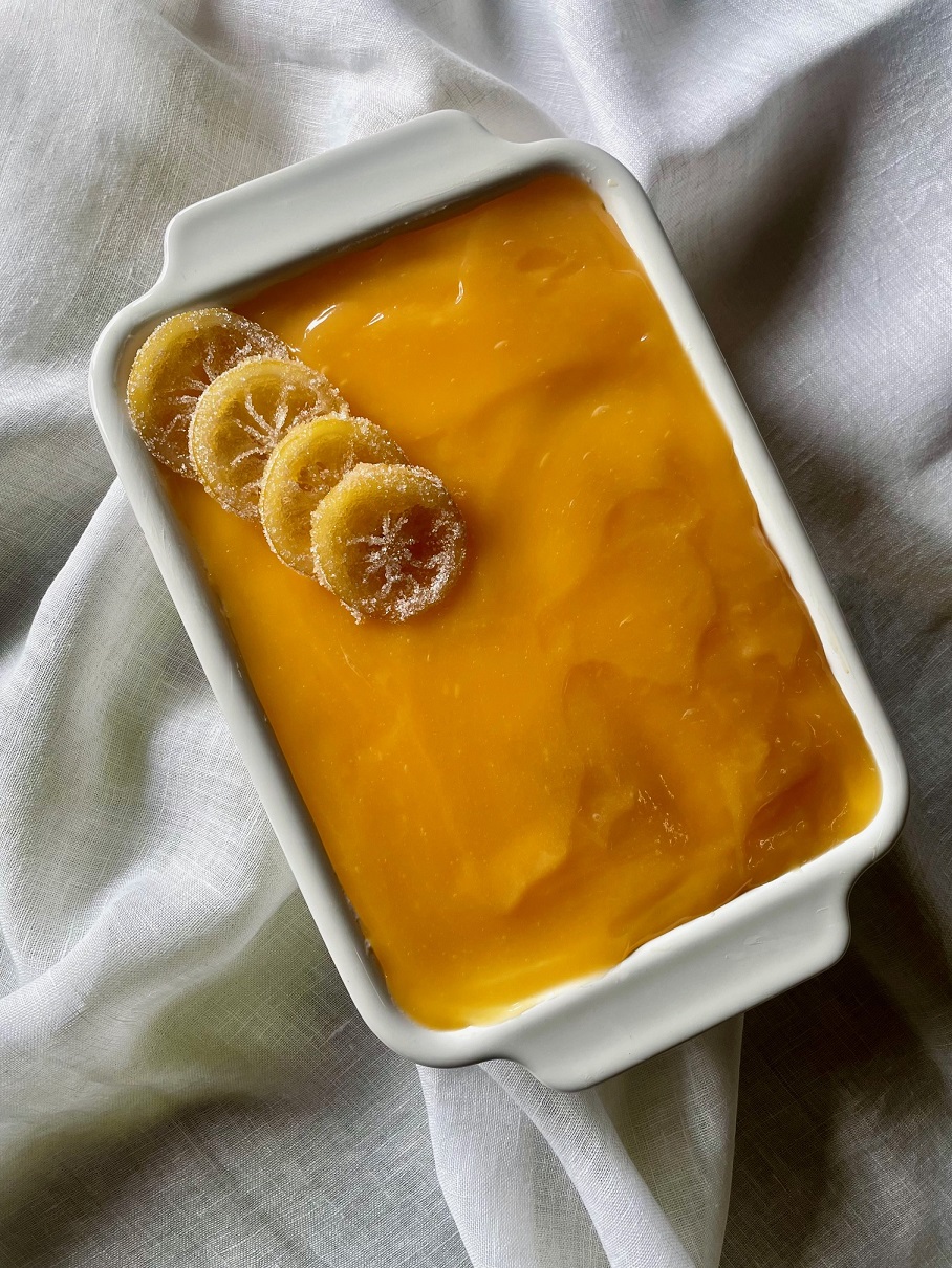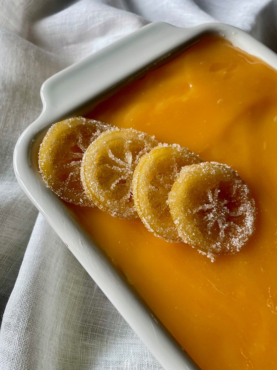 Παγώνουμε στο ψυγείο για 2-3 ώρες για να σφίξει το γλυκό αλλά το βγάζουμε τουλάχιστον 20΄ πριν να το φάμε. Διακοσμούμε προαιρετικά (βλ. tips) με γλασαρισμένες και ζαχαρωμένες φέτες λεμονιού που φτιάχνουμε ως εξής: κόβουμε ένα λεμόνι σε λεπτές φέτες, αφαιρούμε τα κουκούτσια, τις ζεματάμε για 2΄ σε βραστό νερό, τις βγάζουμε με τρυπητή κουτάλα και τις βαπτίζουμε σε μπολ με κρύο νερό και παγάκια. Σε ένα κατσαρολάκι φέρνουμε σε βρασμό 1 φλ. τσ. νερό και 1 φλ. τσ. ζάχαρη, χαμηλώνουμε τη φωτιά και προσθέτουμε τις φέτες του λεμονιού. Σιγοβράζουμε για αρκετή ώρα μέχρι να γίνουν διάφανες: η διαδικασία θα κρατήσει περίπου 45΄, ενώ κατά διαστήματα και με πολύ απαλές κινήσεις, αναποδογυρίζουμε τις φέτες για να πάρουν σιρόπι και από τις δύο πλευρές. Τις αφαιρούμε με τρυπητή κουτάλα και τις τοποθετούμε στη σχάρα του φούρνου που έχουμε στρώσει με λαδόκολλα. Τις αφήνουμε να στεγνώσουν για αρκετές ώρες (αναλόγως με τη θερμοκρασία και την υγρασία του χώρου, η διαδικασία μπορεί να κρατήσει ολόκληρο εικοσιτετράωρο), ενώ στο μεσοδιάστημα τις γυρίζουμε ανάποδα για να στεγνώσουν και από τις δύο πλευρές. Τις ξεκολλάμε από τη λαδόκολλα με προσοχή και τις φυλάμε σε ερμητικά κλειστό δοχείο. Πριν να τις χρησιμοποιήσουμε τις ρολάρουμε σε κρυσταλλική ζάχαρη.