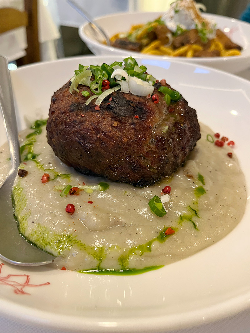 Το εμβληματικό σουτ μακάλο, η παραδοσιακή φλωρινιώτικη αλευρόσαλτσα που φτιάχνεται με σκόρδο, ξίδι, ζωμό κότας, κρόκο Κοζάνης, πάπρικα και αλεύρι, συνοδεύει εδώ ένα βουβαλίσιο μπιφτέκι (19€) αντί για τα κλασικά κεφτεδάκια, σε ένα αποτέλεσμα που ισορροπεί τις έντονες γεύσεις του βουβαλίσιου κιμά με μια άψογα χυλωμένη σάλτσα.