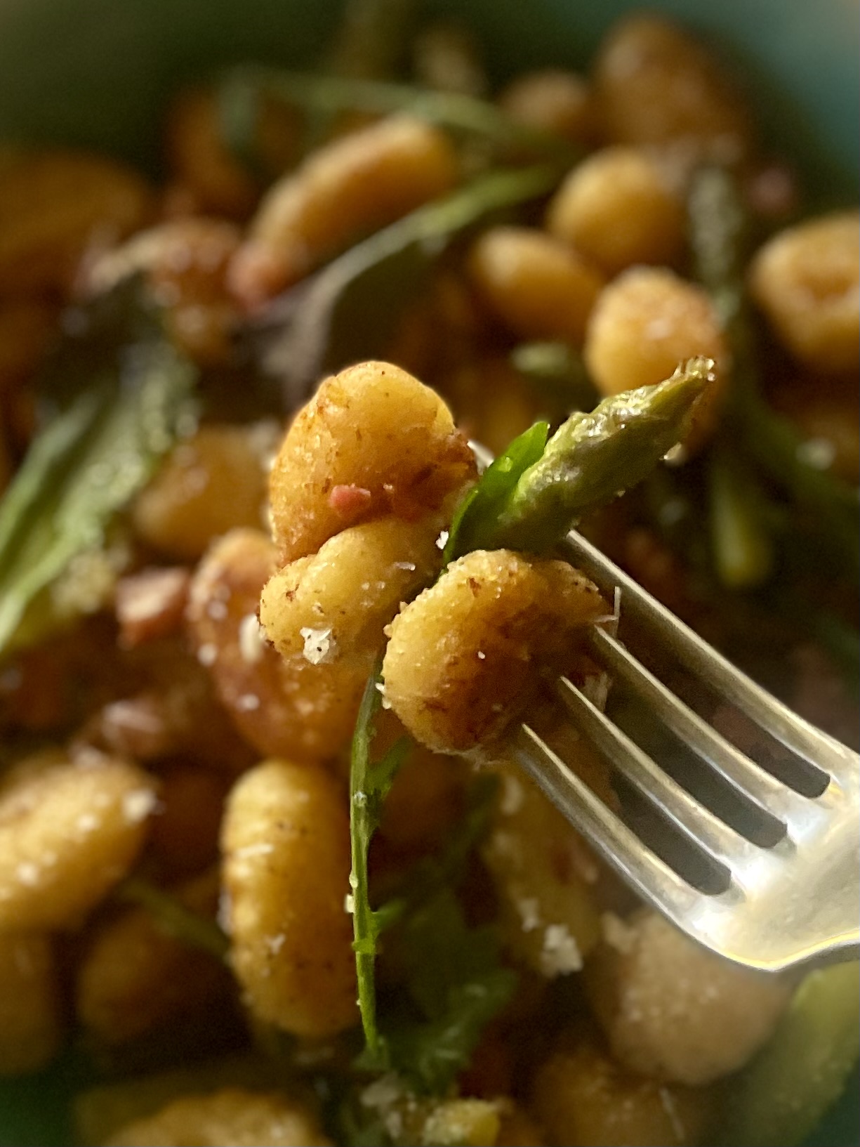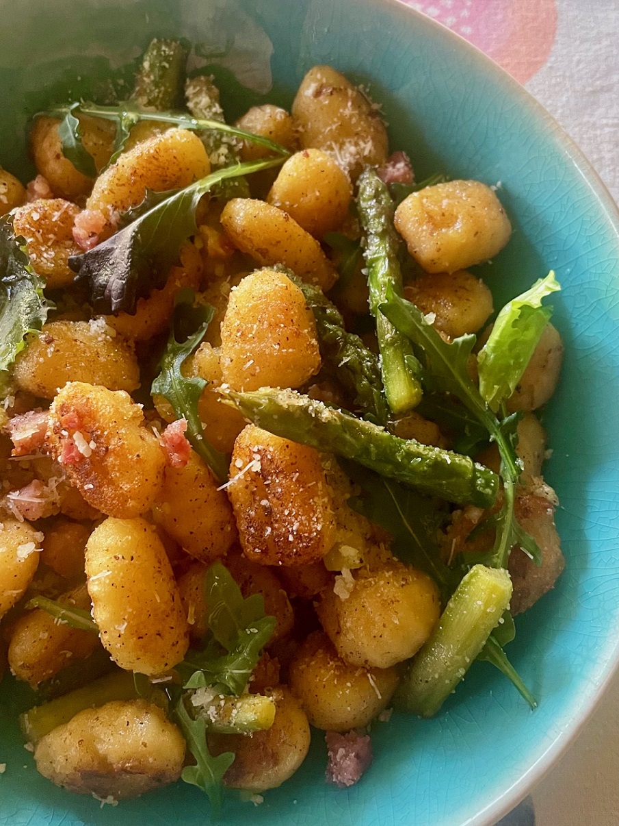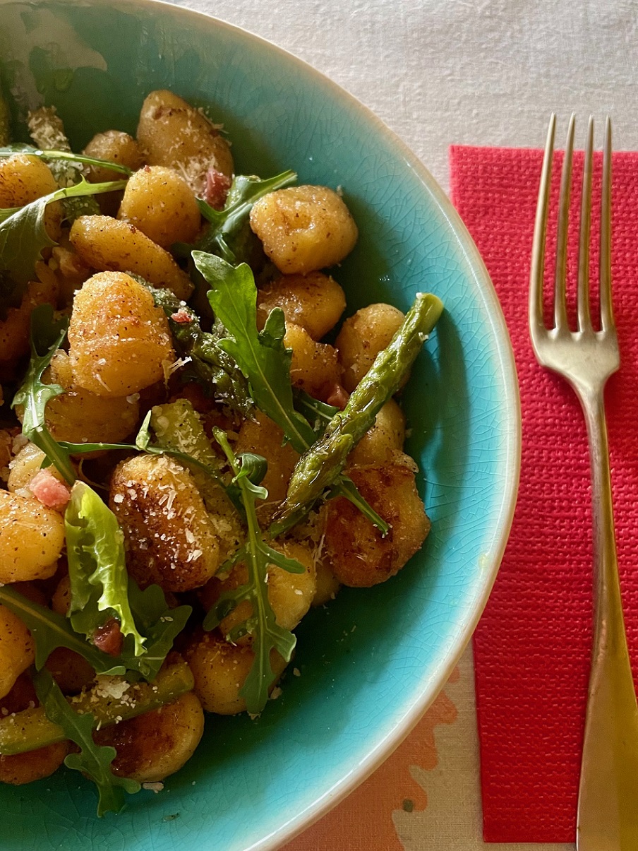 Δείτε μια πανεύκολη και γρήγορη συνταγή για λαχταριστά, χρυσαφένια νιόκι με σπαράγγια και πανσέτα.