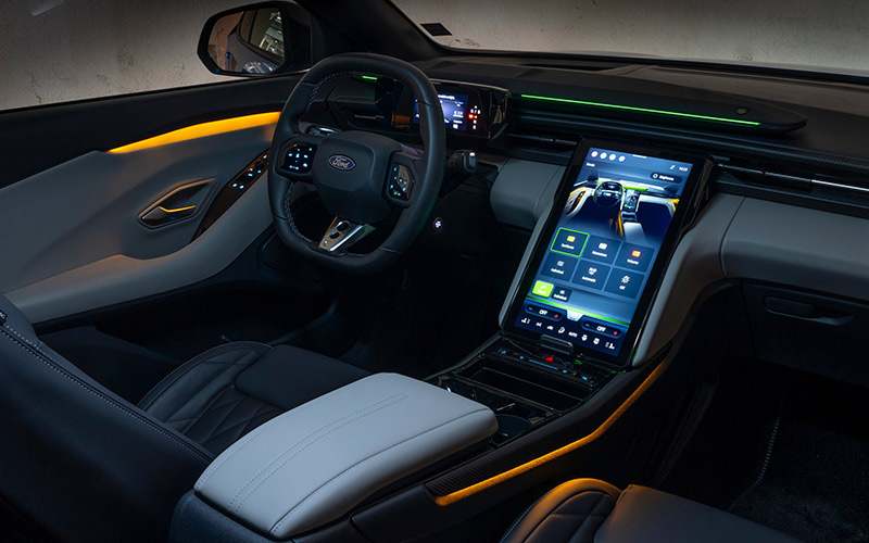 • Το πολυτελές εσωτερικό του ξεχωρίζει για τη μινιμαλιστική του σχεδίαση, με τα ποιοτικά υλικά και τις κορυφαίες τεχνολογίες στον τομέα της συνδεσιμότητας να δίνουν από την πρώτη στιγμή το στίγμα τους. Τα μονοκόμματα εμπρός καθίσματα και η προηγμένη ρυθμιζόμενη οθόνη αφής SYNC Move των 14,6 ιντσών, που μπορεί να μετακινείται ομαλά προς τα πάνω αλλά και προς τα κάτω, εξασφαλίζουν ένα ιδανικό περιβάλλον για όλους τους επιβάτες. Επιπλέον, διαθέτει κορυφαίους χώρους και έξυπνες λύσεις αποθήκευσης, όπως τη MegaConsole χωρητικότητας 17 λίτρων ανάμεσα στα εμπρός καθίσματα και τον «κρυφό» αποθηκευτικό χώρο My Private Locker.